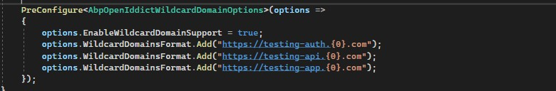 public override void PreConfigureServices(ServiceConfigurationContext context) { // other codes. PreConfigure<AbpOpenIddictAspNetCoreOptions>(options => { options.AddDevelopmentEncryptionAndSigningCertificate = false; }); PreConfigure<OpenIddictServerBuilder>(builder => { builder.AddSigningCertificate(GetSigningCertificate(hostingEnvironment, configuration)); builder.AddEncryptionCertificate(GetSigningCertificate(hostingEnvironment, configuration)); if (!hostingEnvironment.IsProduction()) { builder.SetIssuer(new Uri(configuration["AuthServer:Authority"]!)); } }); PreConfigure<AbpOpenIddictWildcardDomainOptions>(options => { options.EnableWildcardDomainSupport = true; options.WildcardDomainsFormat.Add(configuration["App:AngularWildcardUrl"]); }); PreConfigure<OpenIddictServerOptions>(options => { options.TokenValidationParameters.IssuerValidator = TokenWildcardIssuerValidator.IssuerValidator; options.TokenValidationParameters.ValidIssuers = new[] { configuration["AuthServer:Authority"].EnsureEndsWith('/'), configuration["AuthServer:WildcardAuthority"].EnsureEndsWith('/') }; }); }Note: