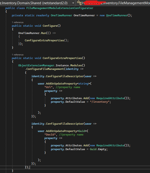 I'm using File Management Module to get Upload methods in another page and I am also using ExtraProperties to add DocId and Url properties to FMFileDescriptor table. I tried for IdentityUser and it works fine, but File Management doesn't.