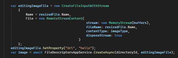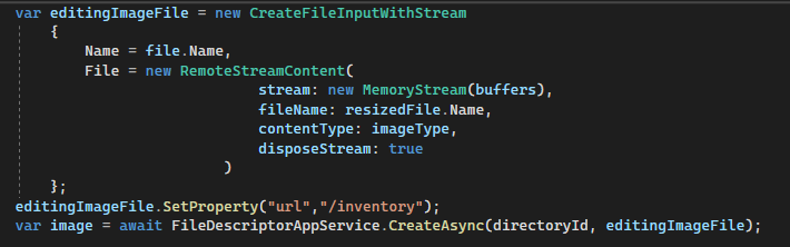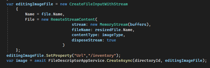 var image = await FileDescriptorsAppService.CreateAsync(directoryId, EditingImageFile);