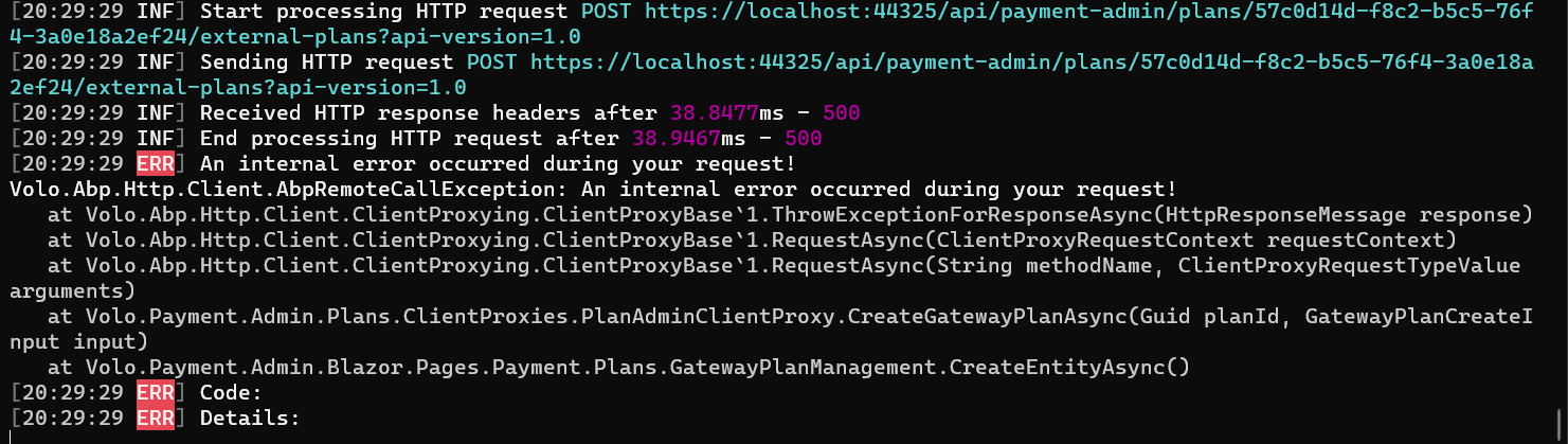 [16:52:42 ERR] ---------- RemoteServiceErrorInfo ---------- { "code": null, "message": "An internal error occurred during your request!", "details": null, "data": {}, "validationErrors": null } [16:52:42 ERR] Object reference not set to an instance of an object. System.NullReferenceException: Object reference not set to an instance of an object. at Volo.Payment.Stripe.Pages.Payment.Stripe.PrePaymentModel.OnPostAsync() at Microsoft.AspNetCore.Mvc.RazorPages.Infrastructure.ExecutorFactory.NonGenericTaskHandlerMethod.Execute(Object receiver, Object[] arguments) at Microsoft.AspNetCore.Mvc.RazorPages.Infrastructure.PageActionInvoker.InvokeHandlerMethodAsync() at Microsoft.AspNetCore.Mvc.RazorPages.Infrastructure.PageActionInvoker.InvokeNextPageFilterAsync() at Microsoft.AspNetCore.Mvc.RazorPages.Infrastructure.PageActionInvoker.Rethrow(PageHandlerExecutedContext context) at Microsoft.AspNetCore.Mvc.RazorPages.Infrastructure.PageActionInvoker.Next(State& next, Scope& scope, Object& state, Boolean& isCompleted) at Microsoft.AspNetCore.Mvc.RazorPages.Infrastructure.PageActionInvoker.InvokeInnerFilterAsync() at Microsoft.AspNetCore.Mvc.Infrastructure.ResourceInvoker.<InvokeNextExceptionFilterAsync>g__Awaited|26_0(ResourceInvoker invoker, Task lastTask, State next, Scope scope, Object state, Boolean isCompleted) [16:52:42 INF] Executed page /Payment/Stripe/PrePayment in 4826.7507ms [16:52:42 INF] Executed endpoint '/Payment/Stripe/PrePayment' [16:52:42 ERR] An unhandled exception has occurred while executing the request. System.NullReferenceException: Object reference not set to an instance of an object. at Volo.Payment.Stripe.Pages.Payment.Stripe.PrePaymentModel.OnPostAsync() at Microsoft.AspNetCore.Mvc.RazorPages.Infrastructure.ExecutorFactory.NonGenericTaskHandlerMethod.Execute(Object receiver, Object[] arguments) at Microsoft.AspNetCore.Mvc.RazorPages.Infrastructure.PageActionInvoker.InvokeHandlerMethodAsync() at Microsoft.AspNetCore.Mvc.RazorPages.Infrastructure.PageActionInvoker.InvokeNextPageFilterAsync() at Microsoft.AspNetCore.Mvc.RazorPages.Infrastructure.PageActionInvoker.Rethrow(PageHandlerExecutedContext context) at Microsoft.AspNetCore.Mvc.RazorPages.Infrastructure.PageActionInvoker.Next(State& next, Scope& scope, Object& state, Boolean& isCompleted) at Microsoft.AspNetCore.Mvc.RazorPages.Infrastructure.PageActionInvoker.InvokeInnerFilterAsync() at Microsoft.AspNetCore.Mvc.Infrastructure.ResourceInvoker.<InvokeNextExceptionFilterAsync>g__Awaited|26_0(ResourceInvoker invoker, Task lastTask, State next, Scope scope, Object state, Boolean isCompleted) at Microsoft.AspNetCore.Mvc.Infrastructure.ResourceInvoker.Rethrow(ExceptionContextSealed context) at Microsoft.AspNetCore.Mvc.Infrastructure.ResourceInvoker.Next(State& next, Scope& scope, Object& state, Boolean& isCompleted) at Microsoft.AspNetCore.Mvc.Infrastructure.ResourceInvoker.<InvokeNextResourceFilter>g__Awaited|25_0(ResourceInvoker invoker, Task lastTask, State next, Scope scope, Object state, Boolean isCompleted) at Microsoft.AspNetCore.Mvc.Infrastructure.ResourceInvoker.Rethrow(ResourceExecutedContextSealed context) at Microsoft.AspNetCore.Mvc.Infrastructure.ResourceInvoker.Next(State& next, Scope& scope, Object& state, Boolean& isCompleted) at Microsoft.AspNetCore.Mvc.Infrastructure.ResourceInvoker.<InvokeFilterPipelineAsync>g__Awaited|20_0(ResourceInvoker invoker, Task lastTask, State next, Scope scope, Object state, Boolean isCompleted) at Microsoft.AspNetCore.Mvc.Infrastructure.ResourceInvoker.<InvokeAsync>g__Logged|17_1(ResourceInvoker invoker) at Microsoft.AspNetCore.Mvc.Infrastructure.ResourceInvoker.<InvokeAsync>g__Logged|17_1(ResourceInvoker invoker) at Microsoft.AspNetCore.Routing.EndpointMiddleware.<Invoke>g__AwaitRequestTask|6_0(Endpoint endpoint, Task requestTask, ILogger logger) at Volo.Abp.AspNetCore.Serilog.AbpSerilogMiddleware.InvokeAsync(HttpContext context, RequestDelegate next) at Microsoft.AspNetCore.Builder.UseMiddlewareExtensions.<>c__DisplayClass6_1.<<UseMiddlewareInterface>b__1>d.MoveNext() --- End of stack trace from previous location --- at Microsoft.AspNetCore.Authorization.AuthorizationMiddleware.Invoke(HttpContext context) at Volo.Abp.AspNetCore.MultiTenancy.MultiTenancyMiddleware.InvokeAsync(HttpContext context, RequestDelegate next) at Microsoft.AspNetCore.Builder.UseMiddlewareExtensions.<>c__DisplayClass6_1.<<UseMiddlewareInterface>b__1>d.MoveNext() --- End of stack trace from previous location --- at Microsoft.AspNetCore.Authentication.AuthenticationMiddleware.Invoke(HttpContext context) at Volo.Abp.AspNetCore.Security.AbpSecurityHeadersMiddleware.InvokeAsync(HttpContext context, RequestDelegate next) at Microsoft.AspNetCore.Builder.UseMiddlewareExtensions.<>c__DisplayClass6_1.<<UseMiddlewareInterface>b__1>d.MoveNext() --- End of stack trace from previous location --- at Microsoft.AspNetCore.Localization.RequestLocalizationMiddleware.Invoke(HttpContext context) at Microsoft.AspNetCore.RequestLocalization.AbpRequestLocalizationMiddleware.InvokeAsync(HttpContext context, RequestDelegate next) at Microsoft.AspNetCore.Builder.UseMiddlewareExtensions.<>c__DisplayClass6_1.<<UseMiddlewareInterface>b__1>d.MoveNext() --- End of stack trace from previous location --- at Microsoft.AspNetCore.Diagnostics.DeveloperExceptionPageMiddlewareImpl.Invoke(HttpContext context) [16:52:42 INF] Request finished HTTP/1.1 POST https://localhost:44383/Payment/Stripe/PrePayment?paymentRequestId=5bb159f7-62e9-422d-3f9c-3a0e5a62756d application/x-www-form-urlencoded 182 - 500 - text/html;+charset=utf-8 4838.2090msI will also add my ShopController.cs if its any help