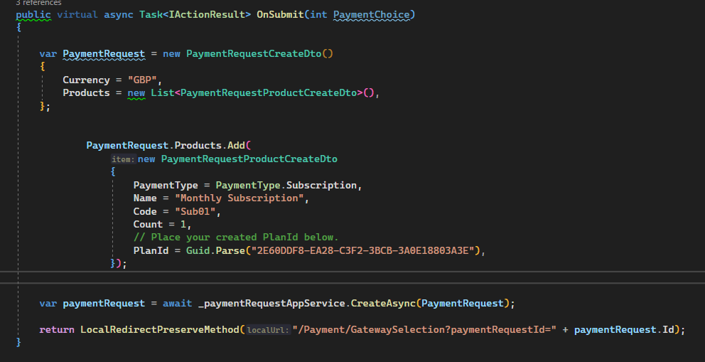 [HttpPost] [ActionName("OnPost")] [ValidateAntiForgeryToken] public async Task<IActionResult> OnPostAsync() { var paymentRequest = await _paymentRequestAppService.CreateAsync(new PaymentRequestCreateDto() { Currency = "EUR", Products = new List<PaymentRequestProductCreateDto>() { new PaymentRequestProductCreateDto { Code = "prod_OnDAVUNq44gU1v", Name = "1000 store credits", Count = 1, UnitPrice = 10, TotalPrice = 10 } }, }); return LocalRedirectPreserveMethod("/Payment/GatewaySelection?paymentRequestId=" + paymentRequest.Id); }Any help is welcome.