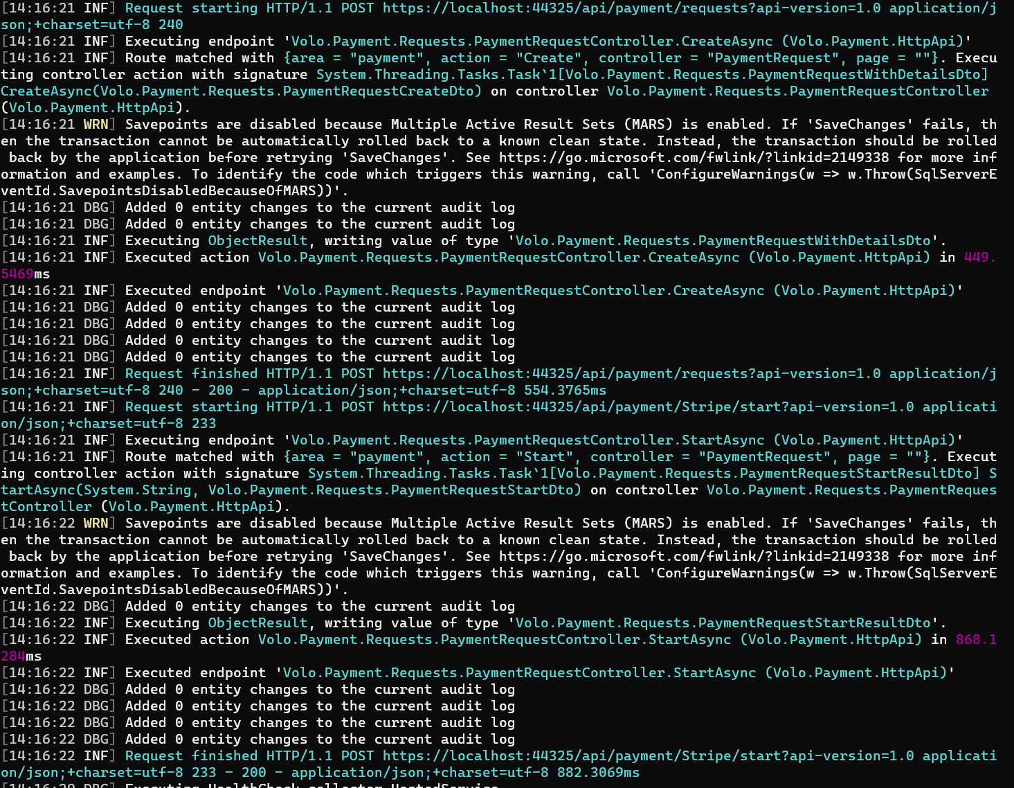 [21:13:58 WRN] Savepoints are disabled because Multiple Active Result Sets (MARS) is enabled. If 'SaveChanges' fails, then the transaction cannot be automatically rolled back to a known clean state. Instead, the transaction should be rolled back by the application before retrying 'SaveChanges'. See https://go.microsoft.com/fwlink/?linkid=2149338 for more information and examples. To identify the code which triggers this warning, call 'ConfigureWarnings(w => w.Throw(SqlServerEventId.SavepointsDisabledBecauseOfMARS))'. [21:13:58 ERR] Failed executing DbCommand (3ms) [Parameters=[@p0='?' (Size = 450), @p1='?' (DbType = Guid), @p2='?' (Size = 4000), @p3='?' (Size = 4000)], CommandType='Text', CommandTimeout='30'] SET IMPLICIT_TRANSACTIONS OFF; SET NOCOUNT ON; INSERT INTO [PayGatewayPlans] ([Gateway], [PlanId], [ExternalId], [ExtraProperties]) VALUES (@p0, @p1, @p2, @p3); [21:13:58 ERR] An exception occurred in the database while saving changes for context type 'Volo.Payment.EntityFrameworkCore.PaymentDbContext'. Microsoft.EntityFrameworkCore.DbUpdateException: An error occurred while saving the entity changes. See the inner exception for details. ---> Microsoft.Data.SqlClient.SqlException (0x80131904): Violation of PRIMARY KEY constraint 'PK_PayGatewayPlans'. Cannot insert duplicate key in object 'dbo.PayGatewayPlans'. The duplicate key value is (2e60ddf8-ea28-c3f2-3bcb-3a0e18803a3e, stripe). The statement has been terminated. at Microsoft.Data.SqlClient.SqlCommand.<>c.<ExecuteDbDataReaderAsync>b__208_0(Task