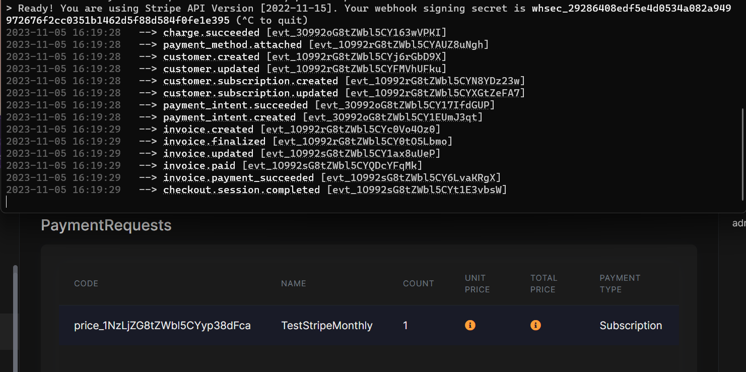 var foobar = new PaymentRequestStartDto() { CancelUrl = "https://testurl.co.uk", PaymentRequestId = paymentRequest.Id, ReturnUrl = "https://testurl.com/Payment/GatewaySelection?paymentRequestId=" + paymentRequest.Id }; _paymentRequestAppService.StartAsync("Stripe", foobar);I still do not get the choice of payment gateways for my single option, and nothing redirects to the payment page. According to the stripe logs, I should be getting a JSON back with a checkout URL, but that's not hitting my system at all.