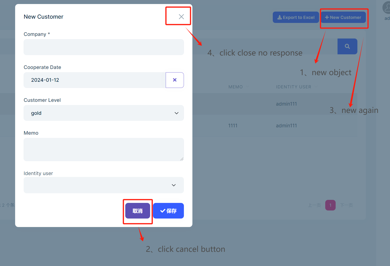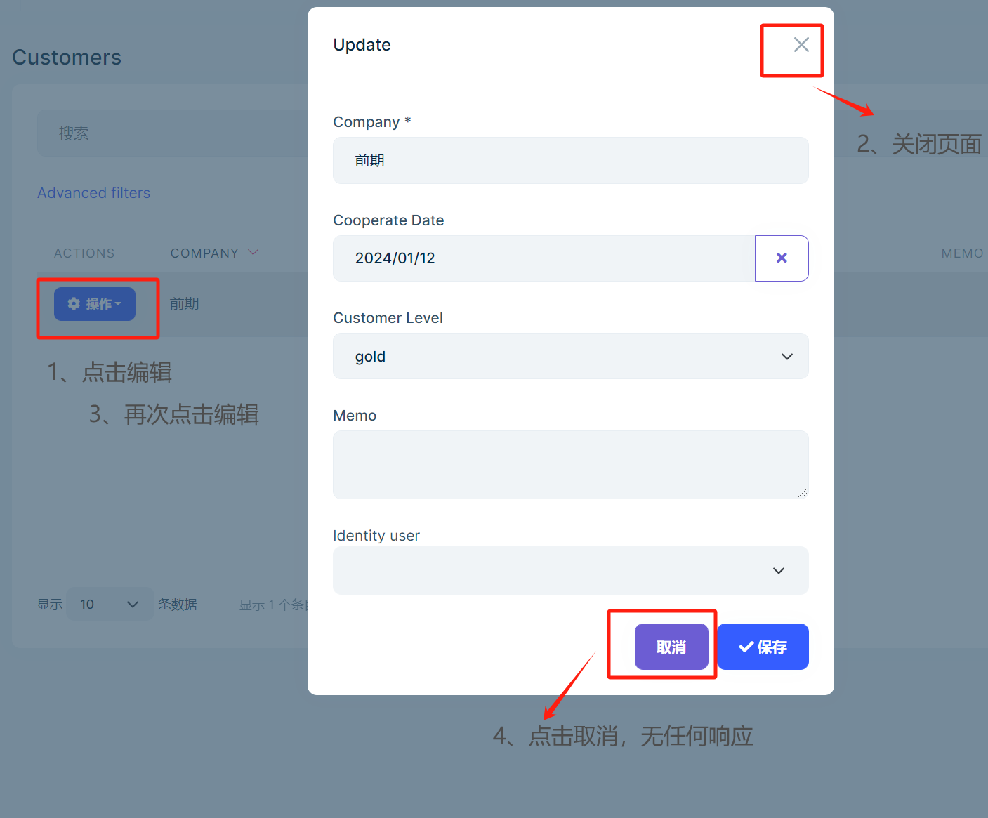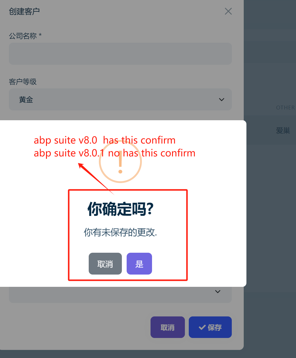 1、abp suite build entity A 2、run system , create A 3、edit A, but Cancel button \ close button IS no response