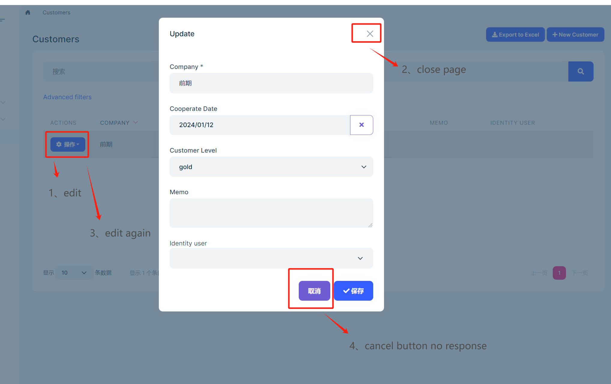 Thanks.no see err log 1、you can click edit butoon, and then click close button ,is ok 2、can click edit button,and then click cacel button, is no response