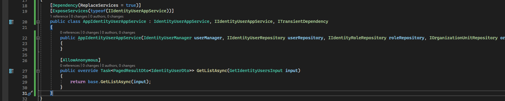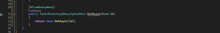 I've tried following https://docs.abp.io/en/abp/latest/Customizing-Application-Modules-Overriding-Services however when I hand in the [AllowAnonymous] tag against the method before calling base.get() etc, it still throws back an authorisation required.