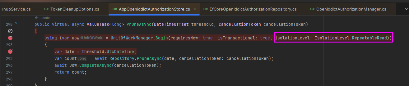 public override void ConfigureServices(ServiceConfigurationContext context) { context.Services.AddOpenIddict() .AddCore(builder => { builder .AddApplicationStore<MyAbpOpenIddictApplicationStore>() .AddAuthorizationStore<MyAbpOpenIddictAuthorizationStore>() .AddTokenStore<MyAbpOpenIddictTokenStore>(); }); }public class MyAbpOpenIddictApplicationStore : AbpOpenIddictApplicationStore { public MyAbpOpenIddictApplicationStore(IOpenIddictApplicationRepository repository, IUnitOfWorkManager unitOfWorkManager, IOpenIddictTokenRepository tokenRepository, IGuidGenerator guidGenerator, AbpOpenIddictIdentifierConverter identifierConverter, IOpenIddictDbConcurrencyExceptionHandler concurrencyExceptionHandler) : base(repository, unitOfWorkManager, tokenRepository, guidGenerator, identifierConverter, concurrencyExceptionHandler) { } public async override ValueTask DeleteAsync(OpenIddictApplicationModel application, CancellationToken cancellationToken) { Check.NotNull(application, nameof(application)); try { using (var uow = UnitOfWorkManager.Begin(requiresNew: true, isTransactional: true, isolationLevel: IsolationLevel.ReadCommitted)) { await TokenRepository.DeleteManyByApplicationIdAsync(application.Id, cancellationToken: cancellationToken); await Repository.DeleteAsync(application.Id, cancellationToken: cancellationToken); await uow.CompleteAsync(cancellationToken); } } catch (AbpDbConcurrencyException e) { Logger.LogException(e); await ConcurrencyExceptionHandler.HandleAsync(e); throw new OpenIddictExceptions.ConcurrencyException(e.Message, e.InnerException); } } } public class MyAbpOpenIddictAuthorizationStore : AbpOpenIddictAuthorizationStore { public MyAbpOpenIddictAuthorizationStore(IOpenIddictAuthorizationRepository repository, IUnitOfWorkManager unitOfWorkManager, IGuidGenerator guidGenerator, IOpenIddictApplicationRepository applicationRepository, IOpenIddictTokenRepository tokenRepository, AbpOpenIddictIdentifierConverter identifierConverter, IOpenIddictDbConcurrencyExceptionHandler concurrencyExceptionHandler) : base(repository, unitOfWorkManager, guidGenerator, applicationRepository, tokenRepository, identifierConverter, concurrencyExceptionHandler) { } public async override ValueTask DeleteAsync(OpenIddictAuthorizationModel authorization, CancellationToken cancellationToken) { Check.NotNull(authorization, nameof(authorization)); try { using (var uow = UnitOfWorkManager.Begin(requiresNew: true, isTransactional: true, isolationLevel: IsolationLevel.ReadCommitted)) { await TokenRepository.DeleteManyByAuthorizationIdAsync(authorization.Id, cancellationToken: cancellationToken); await Repository.DeleteAsync(authorization.Id, cancellationToken: cancellationToken); await uow.CompleteAsync(cancellationToken); } } catch (AbpDbConcurrencyException e) { Logger.LogException(e); await ConcurrencyExceptionHandler.HandleAsync(e); throw new OpenIddictExceptions.ConcurrencyException(e.Message, e.InnerException); } } public async override ValueTask<long> PruneAsync(DateTimeOffset threshold, CancellationToken cancellationToken) { using (var uow = UnitOfWorkManager.Begin(requiresNew: true, isTransactional: true, isolationLevel: IsolationLevel.ReadCommitted)) { var date = threshold.UtcDateTime; var count = await Repository.PruneAsync(date, cancellationToken: cancellationToken); await uow.CompleteAsync(cancellationToken); return count; } } } public class MyAbpOpenIddictTokenStore : AbpOpenIddictTokenStore { public MyAbpOpenIddictTokenStore(IOpenIddictTokenRepository repository, IUnitOfWorkManager unitOfWorkManager, IGuidGenerator guidGenerator, IOpenIddictApplicationRepository applicationRepository, IOpenIddictAuthorizationRepository authorizationRepository, AbpOpenIddictIdentifierConverter identifierConverter, IOpenIddictDbConcurrencyExceptionHandler concurrencyExceptionHandler) : base(repository, unitOfWorkManager, guidGenerator, applicationRepository, authorizationRepository, identifierConverter, concurrencyExceptionHandler) { } public async override ValueTask<long> PruneAsync(DateTimeOffset threshold, CancellationToken cancellationToken) { using (var uow = UnitOfWorkManager.Begin(requiresNew: true, isTransactional: true, isolationLevel: IsolationLevel.ReadCommitted)) { var date = threshold.UtcDateTime; var count = await Repository.PruneAsync(date, cancellationToken: cancellationToken); await uow.CompleteAsync(cancellationToken); return count; } } }