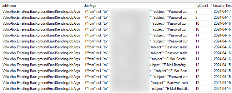 I can see that the AbpBackgroundJobs table is overflowing with failed email jobs: