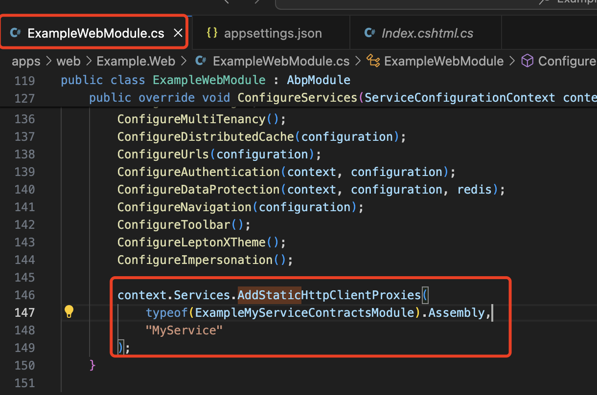 I suspect that we would want to add some dependencies or setup code to the MyServiceModule and MyServiceContractsModule that mimics the HttpApi and HttpApi.Client from the DDD services in the past. I couldn’t glean any information from the other services because they seem to rely on full DDD components through library references.