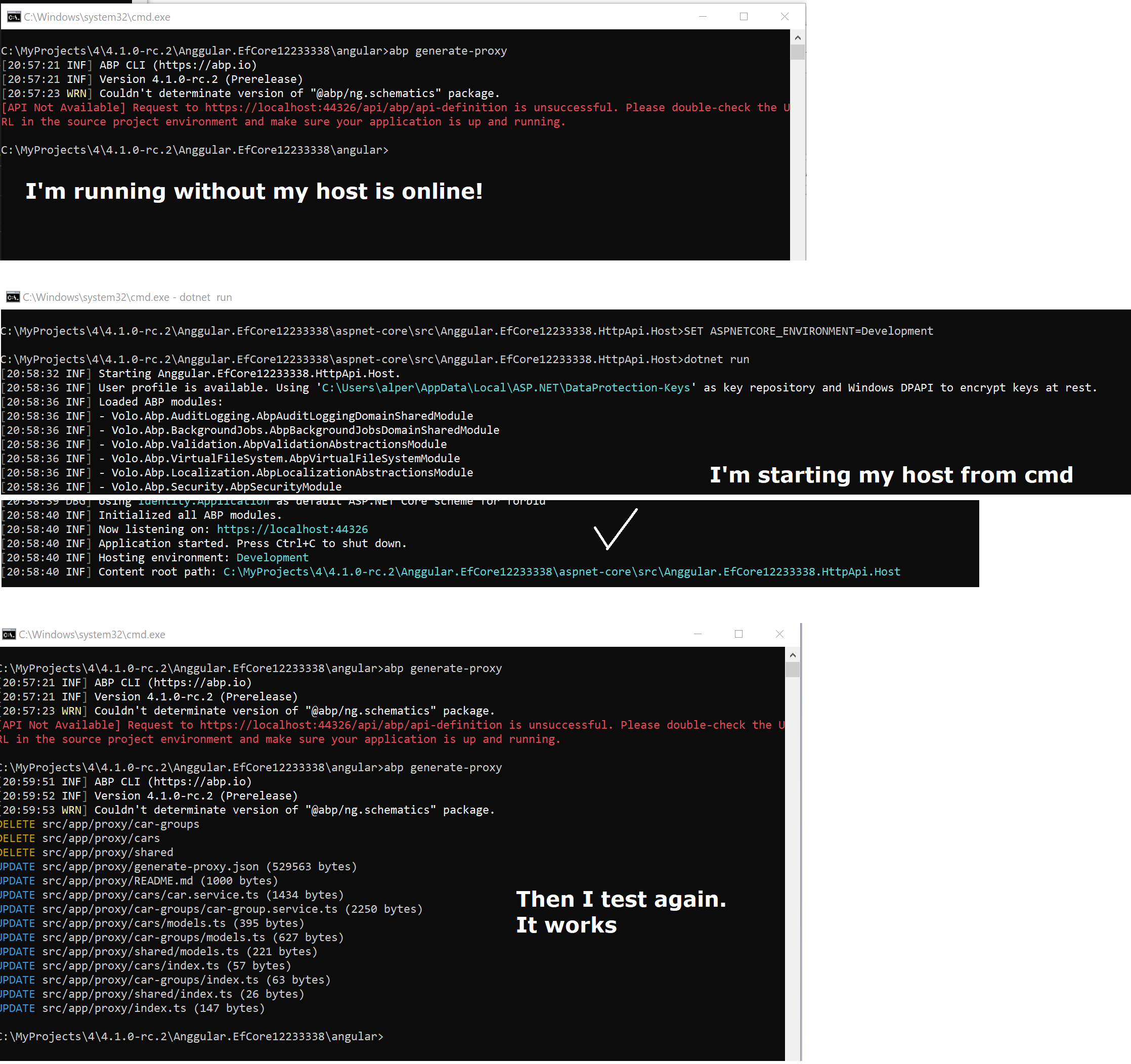 The host server application is running. I am able to access the url: https://localhost:44372/api/abp/api-definition from the browser