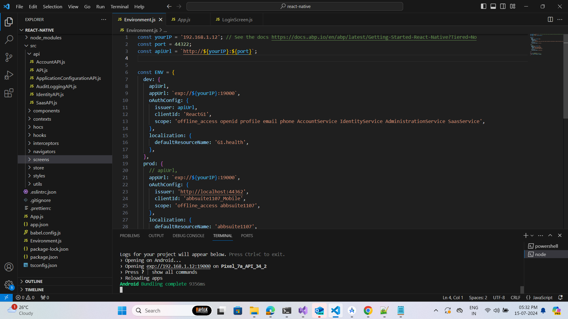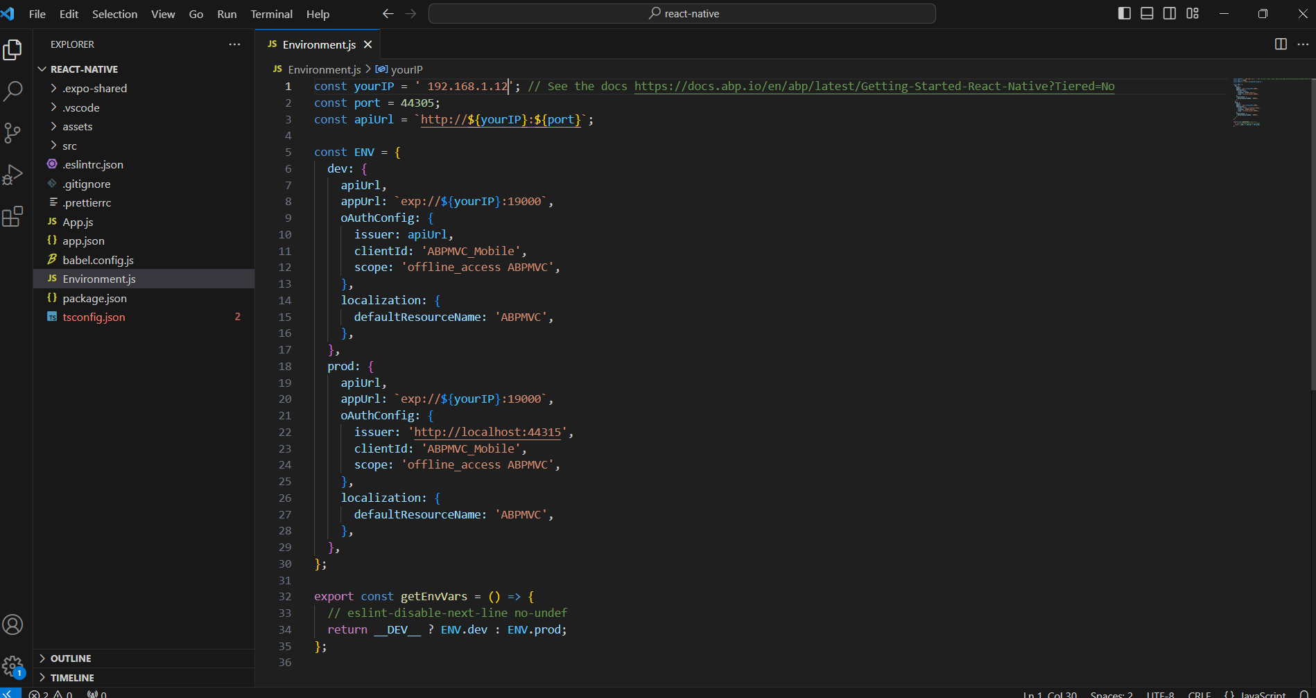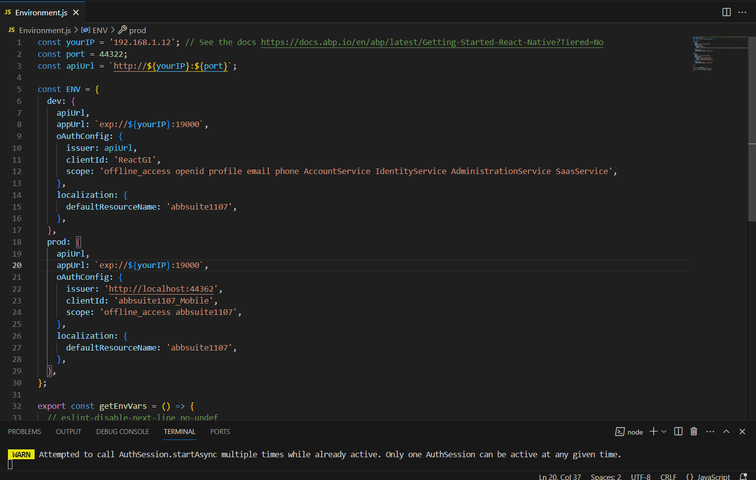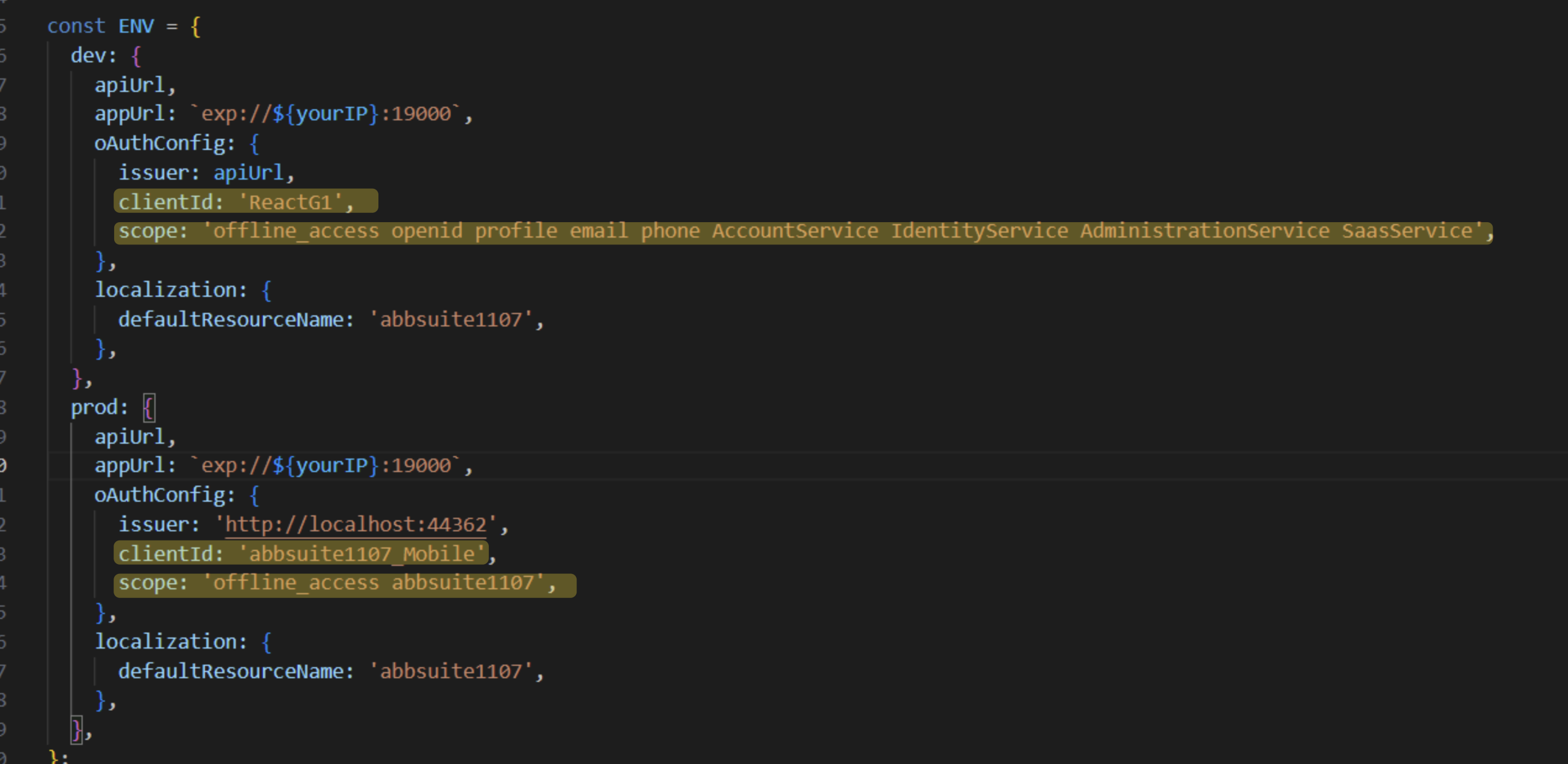 exp://${yourIP}:19000, oAuthConfig: { issuer: apiUrl, clientId: 'ABPMVC_Mobile', scope: 'offline_access ABPMVC', }, localization: { defaultResourceName: 'ABPMVC', }, }, prod: { apiUrl, appUrl:exp://${yourIP}:19000, oAuthConfig: { issuer: 'http://localhost:44315', clientId: 'ABPMVC_Mobile', scope: 'offline_access ABPMVC', }, localization: { defaultResourceName: 'ABPMVC', }, }, };export const getEnvVars = () => { // eslint-disable-next-line no-undef return DEV ? ENV.dev : ENV.prod; };