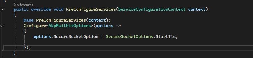 public override void ConfigureServices(ServiceConfigurationContext context) { context.Services.Replace(ServiceDescriptor.Transient<IEmailSender, MailKitSmtpEmailSender>()); } -