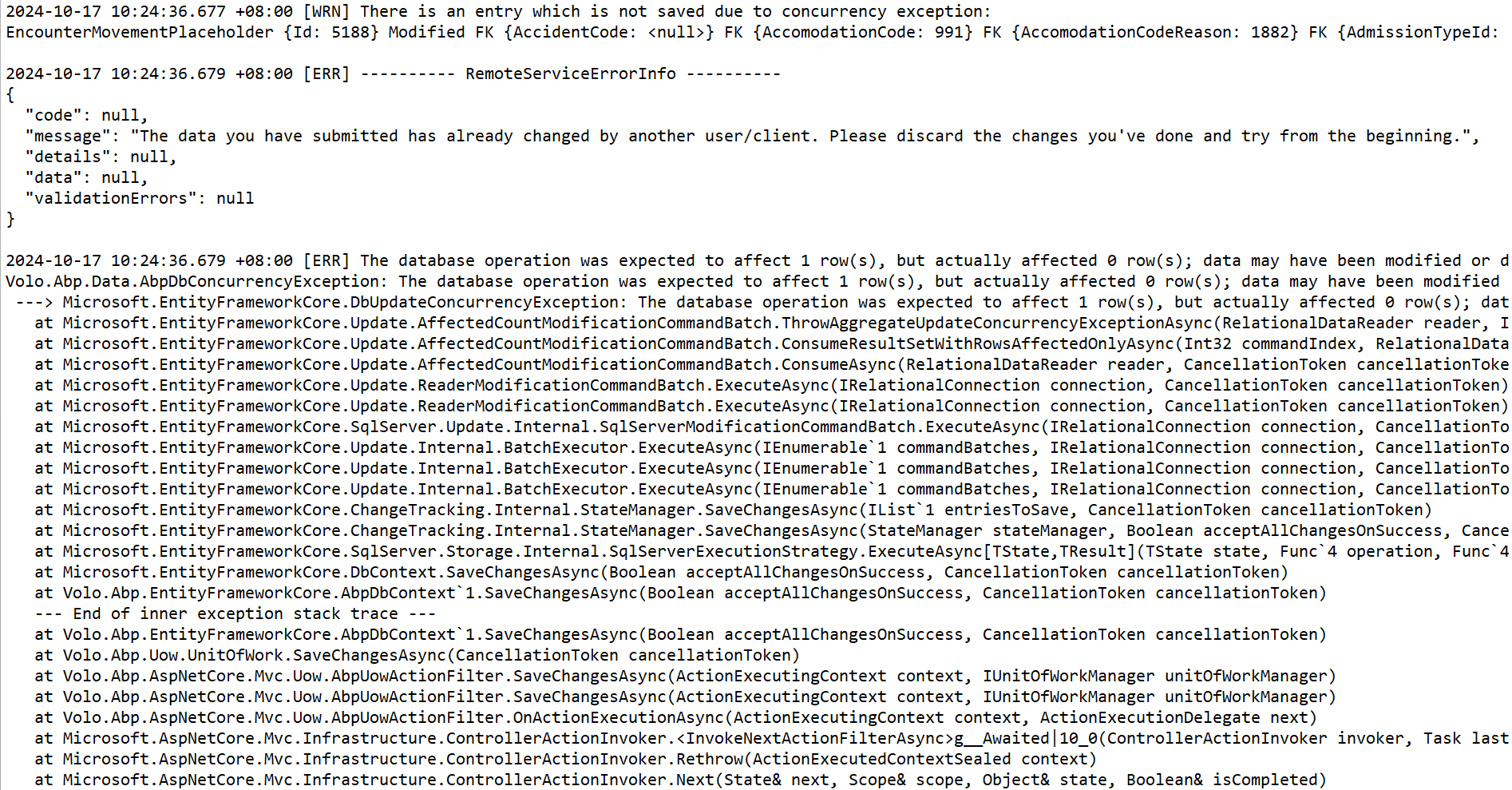 Hi, In both table I don't have ConcurrencyStamp but issue is encountered only in for 1 table, even though I'm doing same operation on both tables.