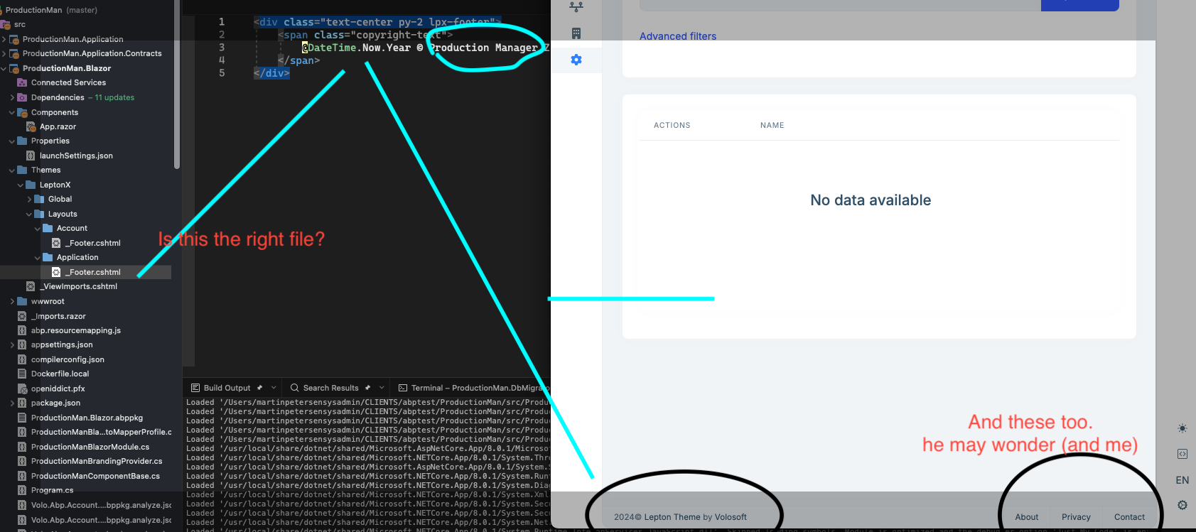 @using Volo.Abp.DependencyInjection @inherits Volo.Abp.AspNetCore.Components.Web.LeptonXTheme.Components.ApplicationLayout.TopMenu.Footer @attribute [Dependency(ReplaceServices = true)] @attribute [ExposeServices(typeof(Volo.Abp.AspNetCore.Components.Web.LeptonXTheme.Components.ApplicationLayout.TopMenu.Footer))] <div class="lpx-footbar-container"> <div class="lpx-footbar"> <div class="lpx-footbar-copyright"> <span>@DateTime.UtcNow.Year©</span> <a href="https://leptontheme.com/" target="_blank">My TopMenu Lepton Theme</a> <span>by</span> <a href="https://volosoft.com/" target="_blank">My TopMenu Volosoft</a> </div> <div class="lpx-footbar-solo-links"> <a href="#">About</a> <a href="#">Privacy</a> <a href="#">Contact</a> </div> </div> </div>if you have
