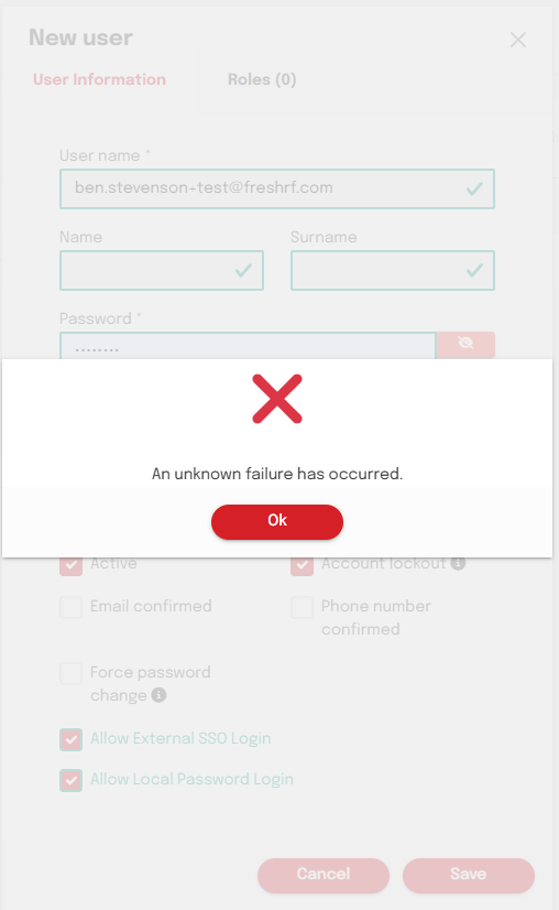 This error is expected and normal, its failing correctly when attempting to add a new User with some dodgy data.