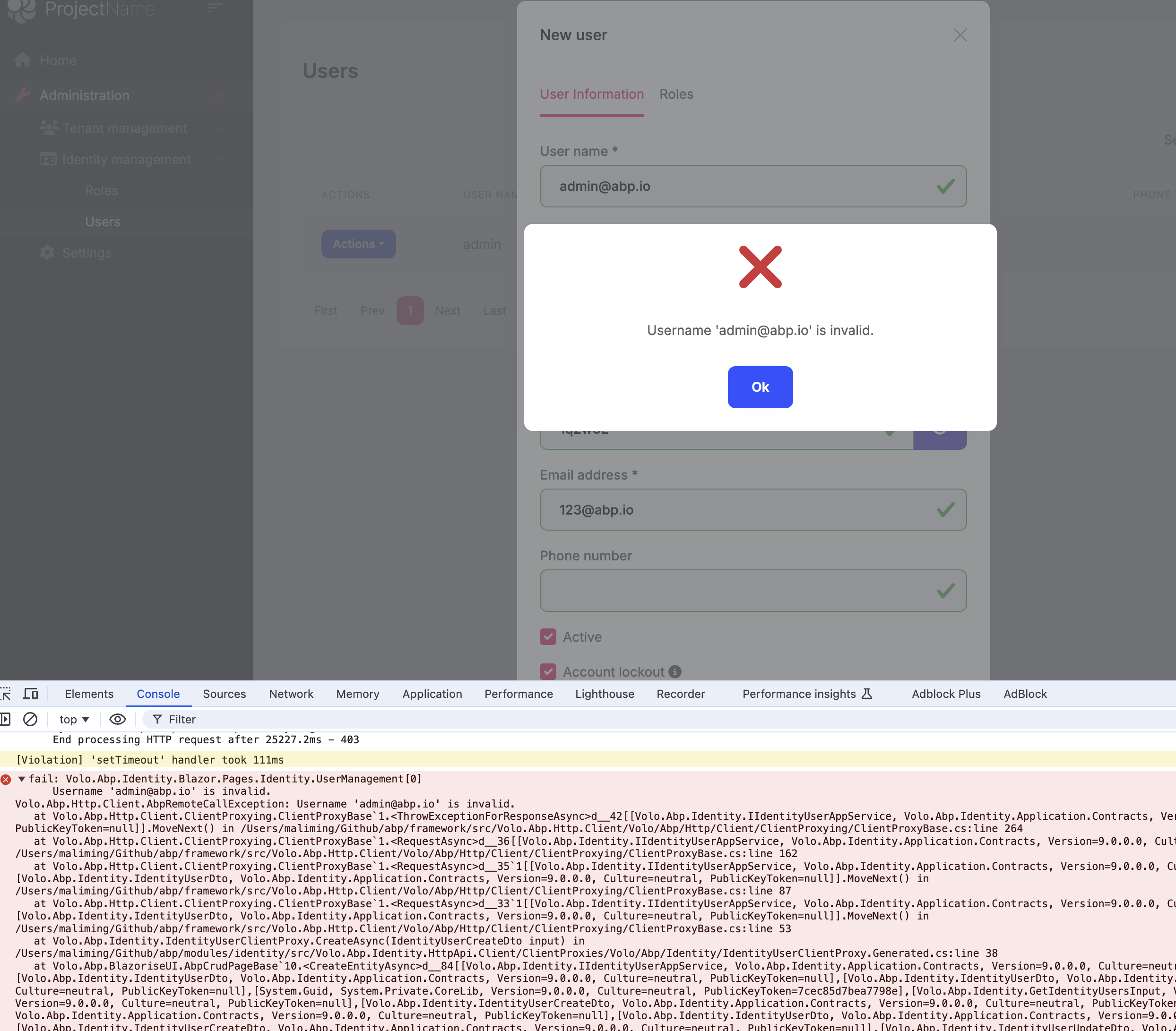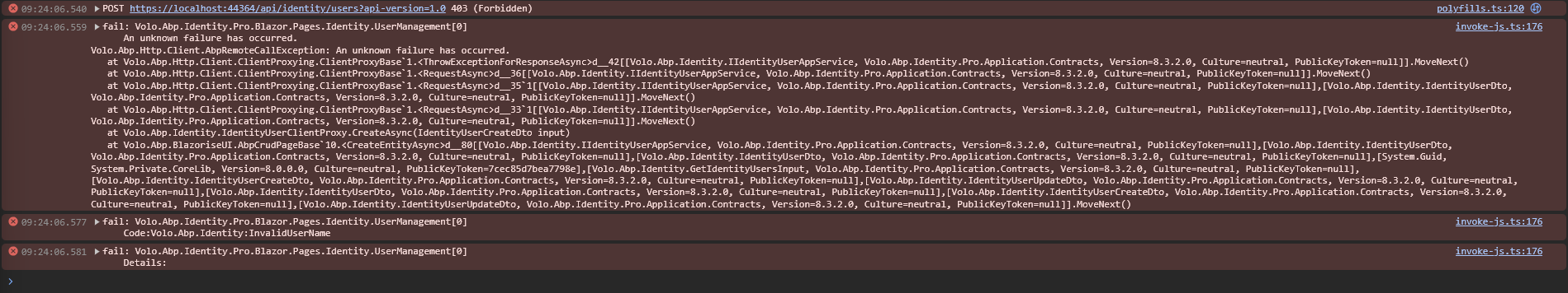 Volo.Abp.Identity:InvalidUserNametext and add the patch code below to your API website."Volo.Abp.Identity:InvalidUserName": "Username '{0}' is invalid, can only contain letters or digits."public class Program { public async static Task<int> Main(string[] args) { var identityStrings = (typeof(AbpIdentityResultExtensions) .GetField("IdentityStrings", BindingFlags.NonPublic | BindingFlags.Static | BindingFlags.Instance) ?.GetValue(null) ?? new Dictionary<string, string>()).As<Dictionary<string, string>>(); if (identityStrings.ContainsKey("InvalidUserName")) { identityStrings["InvalidUserName"] = "Username '{0}' is invalid."; }https://abp.io/community/articles/how-to-override-localization-strings-of-depending-modules-ba1oy03l