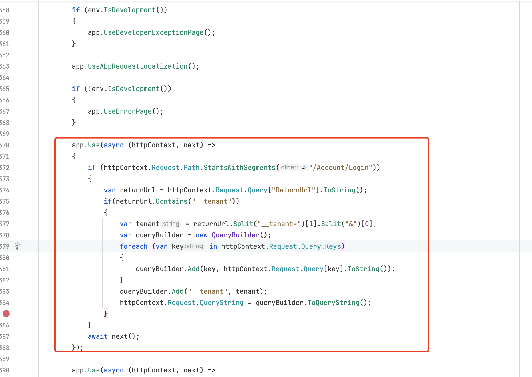 app.Use(async (httpContext, next) => { if (httpContext.Request.Path.StartsWithSegments("/Account/Login")) { var returnUrl = httpContext.Request.Query["ReturnUrl"].ToString(); if(returnUrl.Contains("__tenant")) { var tenant = returnUrl.Split("__tenant=")[1].Split("&")[0]; var queryBuilder = new QueryBuilder(); foreach (var key in httpContext.Request.Query.Keys) { queryBuilder.Add(key, httpContext.Request.Query[key].ToString()); } queryBuilder.Add("__tenant", tenant); httpContext.Request.QueryString = queryBuilder.ToQueryString(); } } await next(); }); -