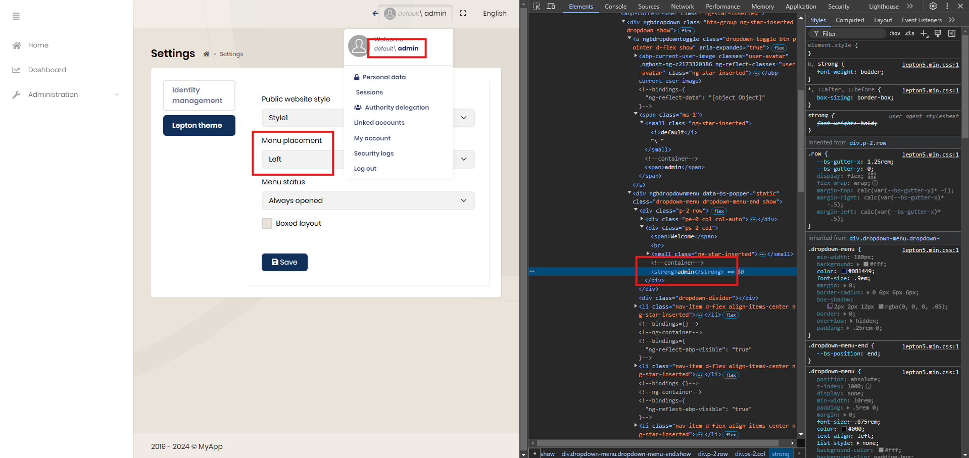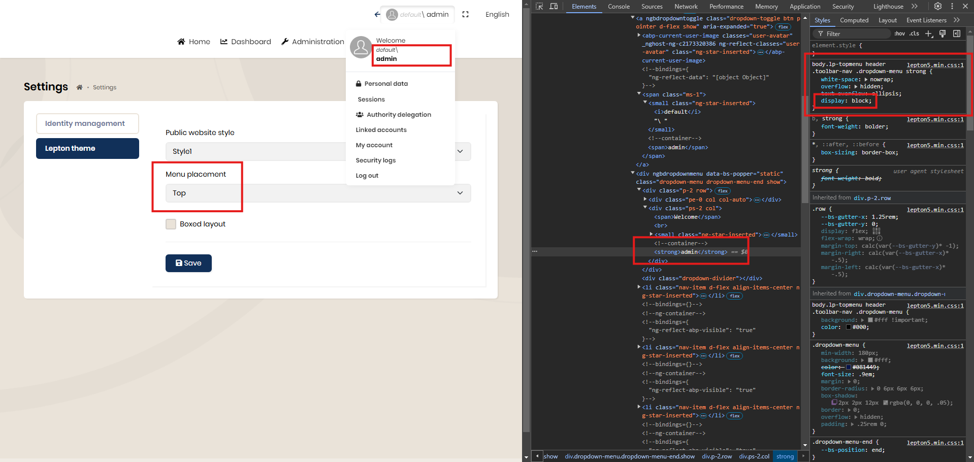 Note: The username moves to the next line because the display: block style is applied to the body.lp-topmenu header .toolbar-nav .dropdown-menu strong class.