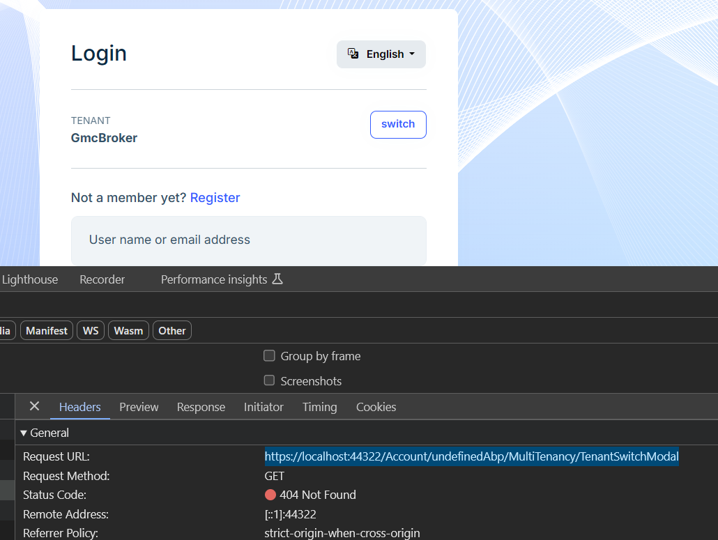 - Steps to reproduce the issue: I migrate my project from 8.3.x to 9.0.0. After update I was not able to change or remove Tenant in login page. The error in show on image below :