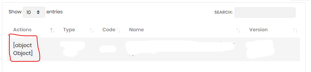 ` var qualListTable = $("#programmeQualificationTable").DataTable( { processing: true, //serverSide: true, paging: true, //searching: false, scrollY: '50vh', autoWidth: true, scrollCollapse: true, columnDefs: [ { title: l('Actions'), rowAction: { items: [ { text: l('Delete'), action: function (data) { ///... } } ] }, }, { title: l("Type") }, { title: l('Code') }, { title: l('Name') }, { title: l('Version') } ] } );`If Possible please share an example.