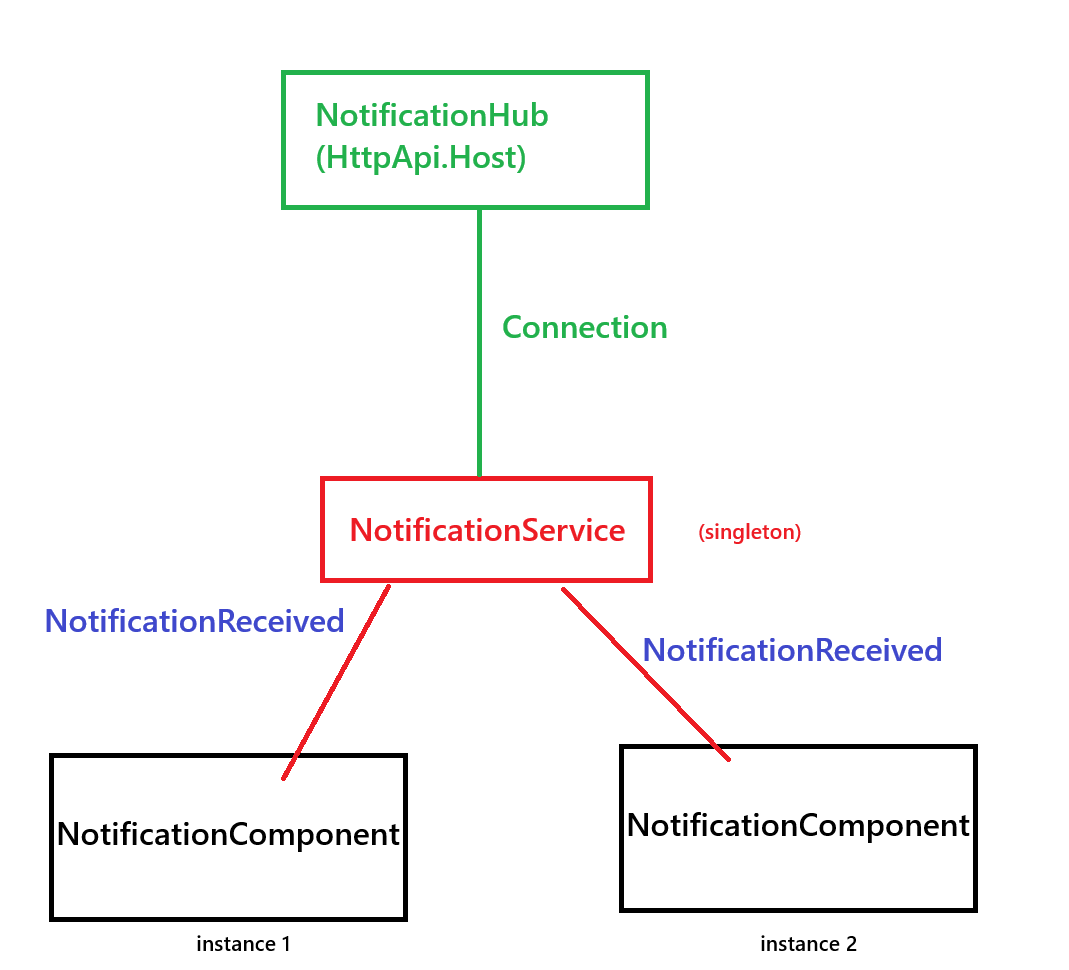 NotificationServicein the client-side is Singleton and it doesn't matter how many time it's resolved. There will be always single hub connection that listens the changes and delivers changes into component by using a C# Event namedOnNotificationReceived. -