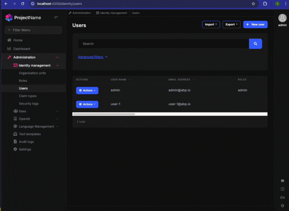 const oAuthConfig = { ... impersonation: { tenantImpersonation: true, userImpersonation: true, }, };Steps to reproduce: