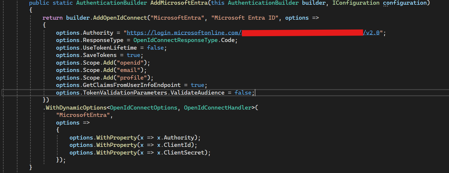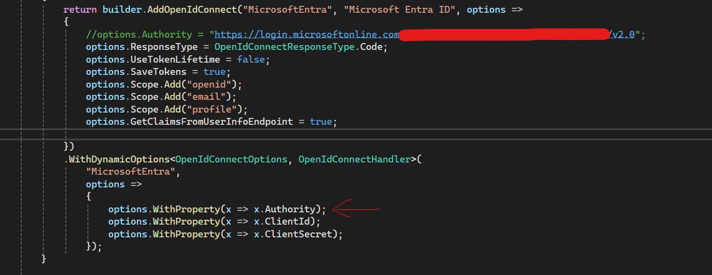 Currently I'm trying to integrate Microsoft Entra Id to my project. I have configured Authority as DynamicOptions property to support the multi-tenant Authority endpoint of Microsoft Entra.