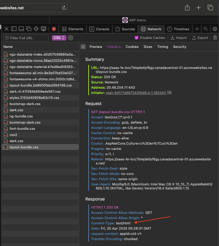 layout-bundle.cssis returning a response withContent-Type: text/htmlinstead oftext/css. This usually means the file isn’t found, and the server is falling back to the default page (e.g.,index.html).Could you please check whether anything in your deployment setup might be redirecting unknown paths (like