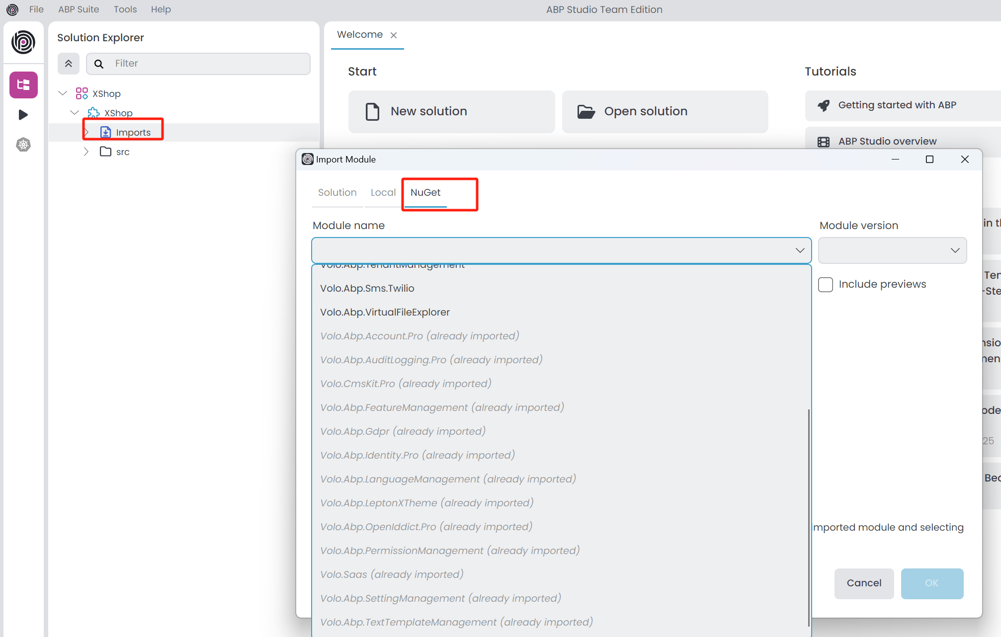 I have created the A.sln solution using ABP Studio (which includes AuthServer, HostApi, and Web). A.sln is my host application. Next, I need to create the B.sln solution, which is my Module. I need to install Module B into Solution A. I would like to use the NuGet method to install the module. How can I publish Module B to the NuGet dropdown list in ABP Studio? By default, the NuGet list does not include my module (please refer to the screenshot attached).