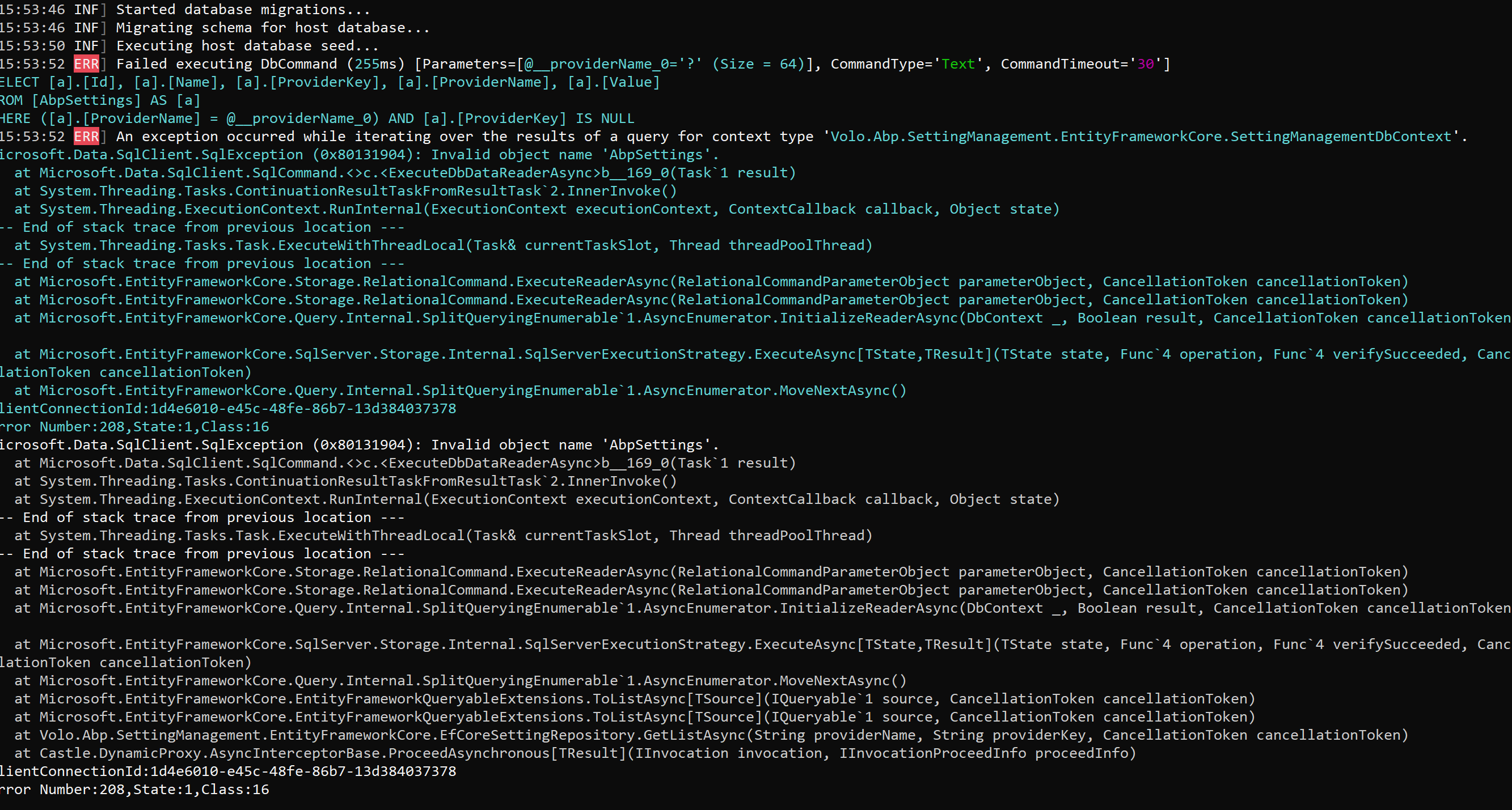 I've put 2 microservices for testing into a docker container that uses mongodb. Authorization works there. I have used the same config in the appsettings.json for dbmigrator and apihost projects for my current project that uses ef core. However when I try to authorize the request I am getting the below error: