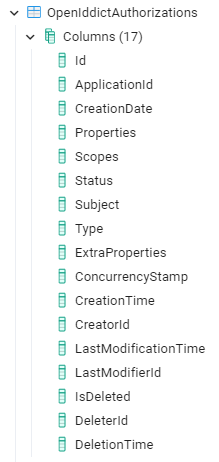 Old App - IdentityServerApiResourceScopes table have only two columns - ApiResourceId, Scope, but similar table from OpenIdDict is expecting too many columns as below.