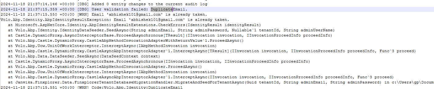 this is happening every time during the initial registration. Lets say, you have USER100, it will say USER100 is duplicate because the migration are running twice.