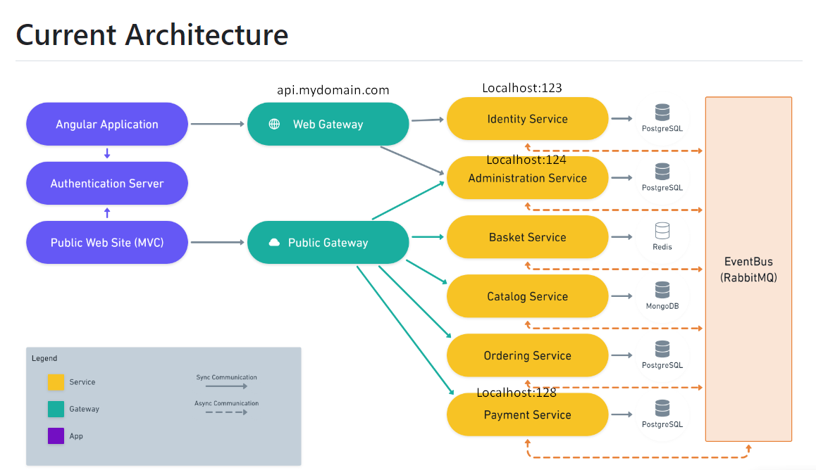 5 microservice 2 gateway (Ocelot) 1 AuthServer 4 application connceted via HttpClient via geteway with DynamicProxy