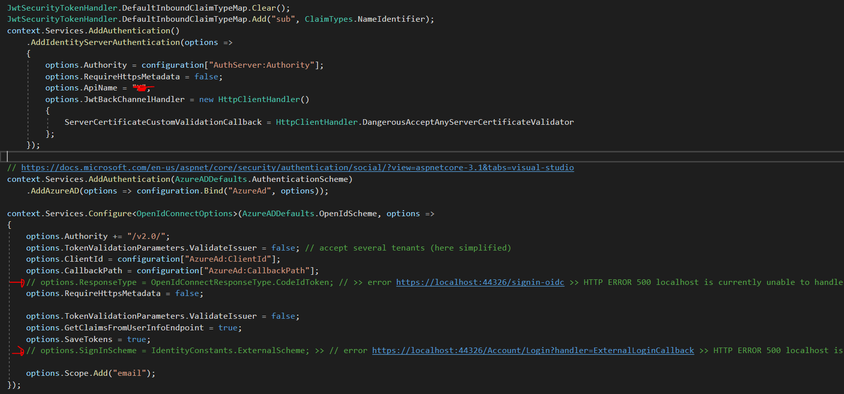 2. If i uncommented options.ResponseType or options.SignInChema, got error. updated : https://docs.abp.io/en/abp/latest/How-To/Azure-Active-Directory-Authentication-MVC