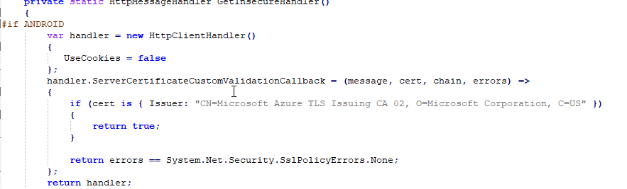 Here is the code. The project references the API that is housed on Azure App Services which is why the cert issuer is from Azure.