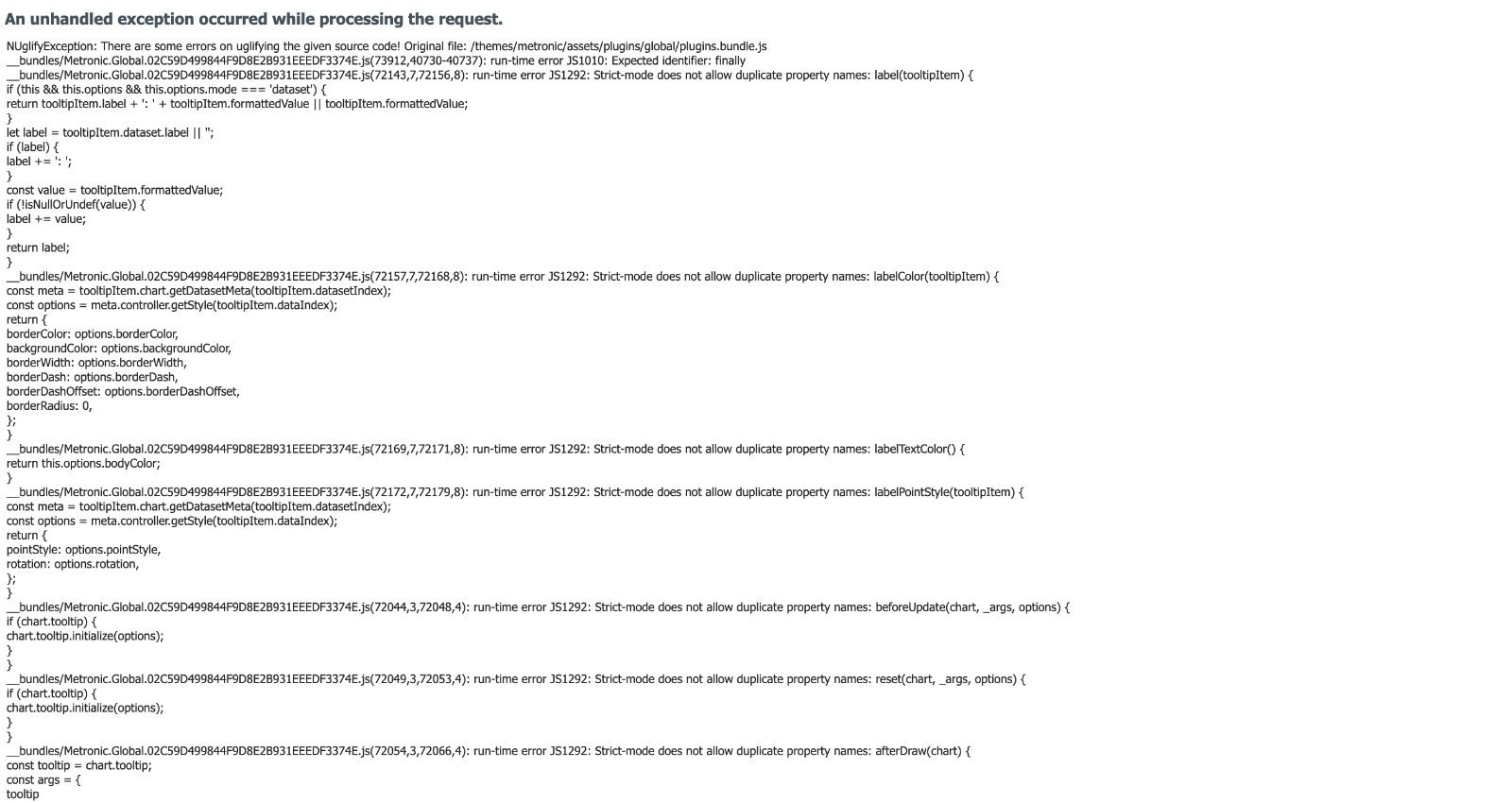 Hi, I have javascript file for a html theme i added this file to Script Contributor class everything was fine but when i changed bundle mode to BundleAndMinify i got this error message "Strict-mode does not allow duplicate property names". This file came with theme so i can not change it. Thanks.