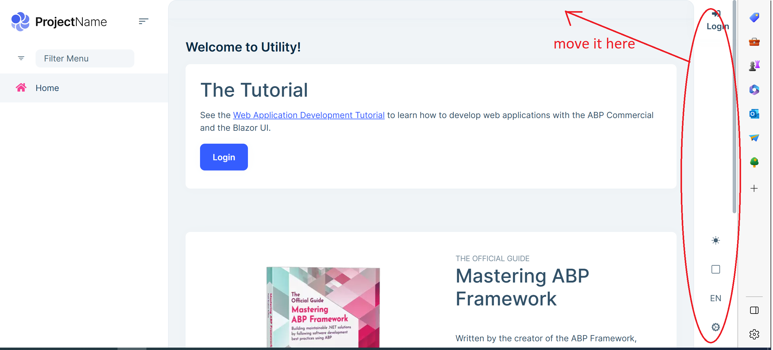 how to move the right panel to the top of the page or fixed place in the menu footer instead of the right panel, if you open it in MS. Edge browser it will display as the following which make the user confused :