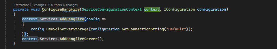 context.Services.AddHangfire(config => { config.UseSqlServerStorage(configuration.GetConnectionString("Default")); });Also, if you followed the Manual Installation process, then ensure your application has the related DependOn attribute with the hangfiremodule: