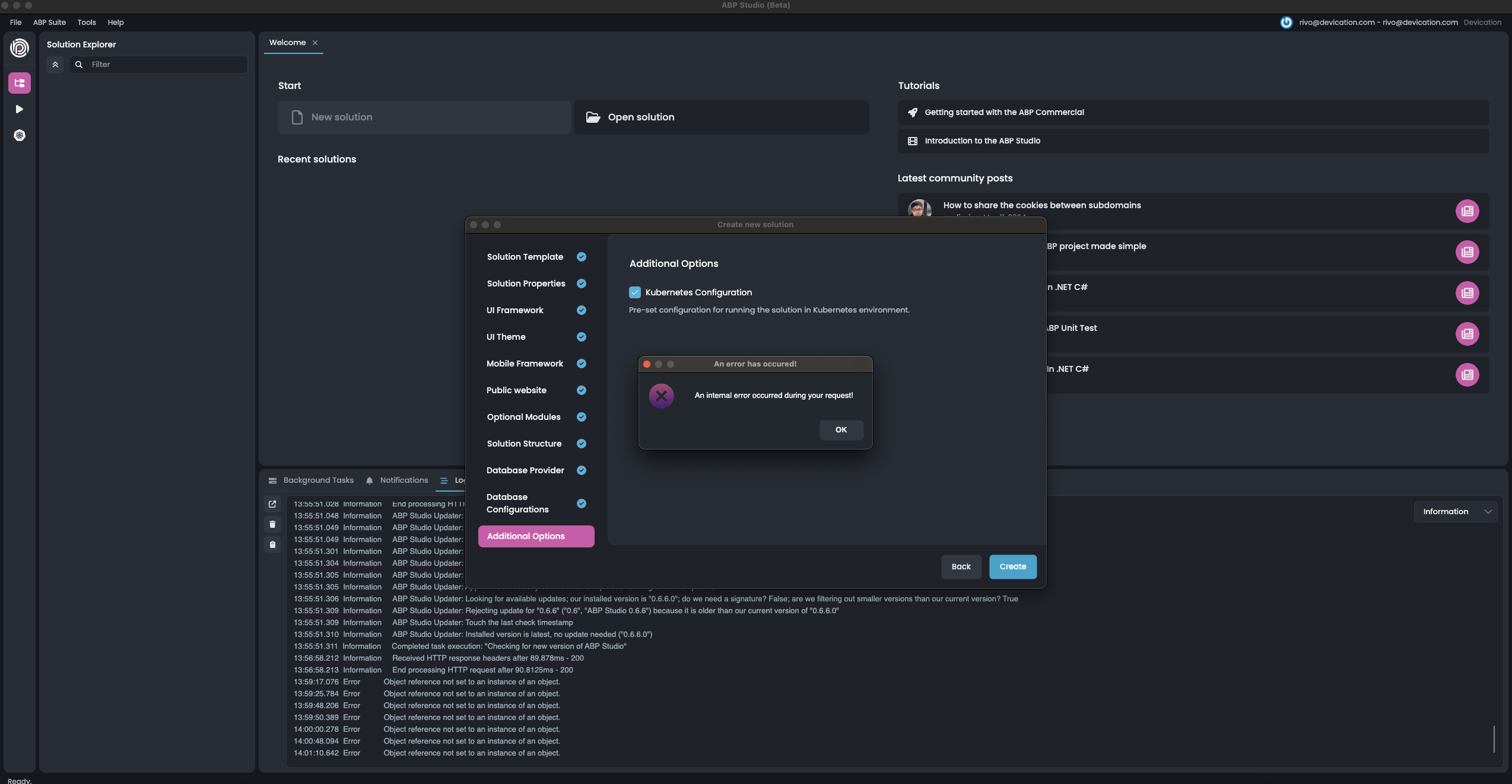 2.) I get an error when trying to create a new solution. "An internal error occurred during your request!"