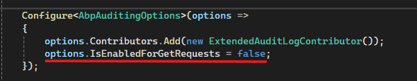 I am configuring IsEnabledForGetRequests of AuditLog as false, and I want to add it to the interface so that it can be dynamically changed instead of being hardcoded in the code. How can I do this? Could you provide a code example