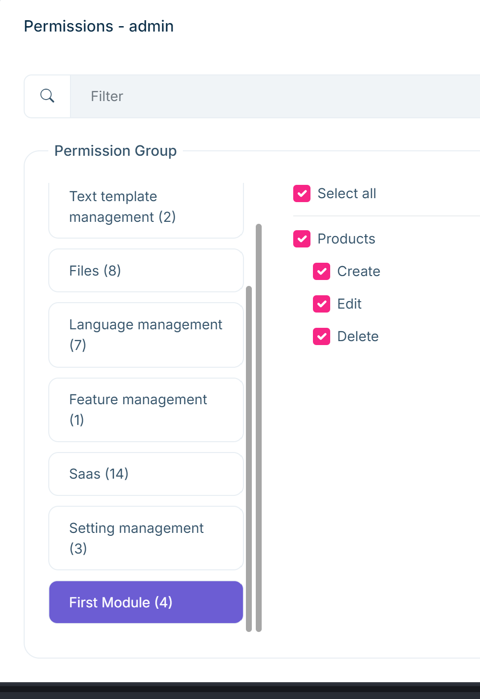Also I can see [FirstModule] under permissions, and I did grant permissions to admin role. Ok, no errors.