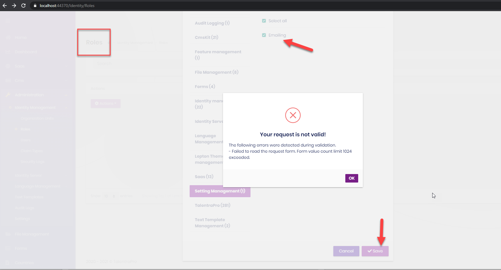 FormOptions. I will check and fix it.Configure<FormOptions>(options => { options.ValueCountLimit = 1024 * 2; //options. });The fix PR https://github.com/abpframework/abp/pull/8810