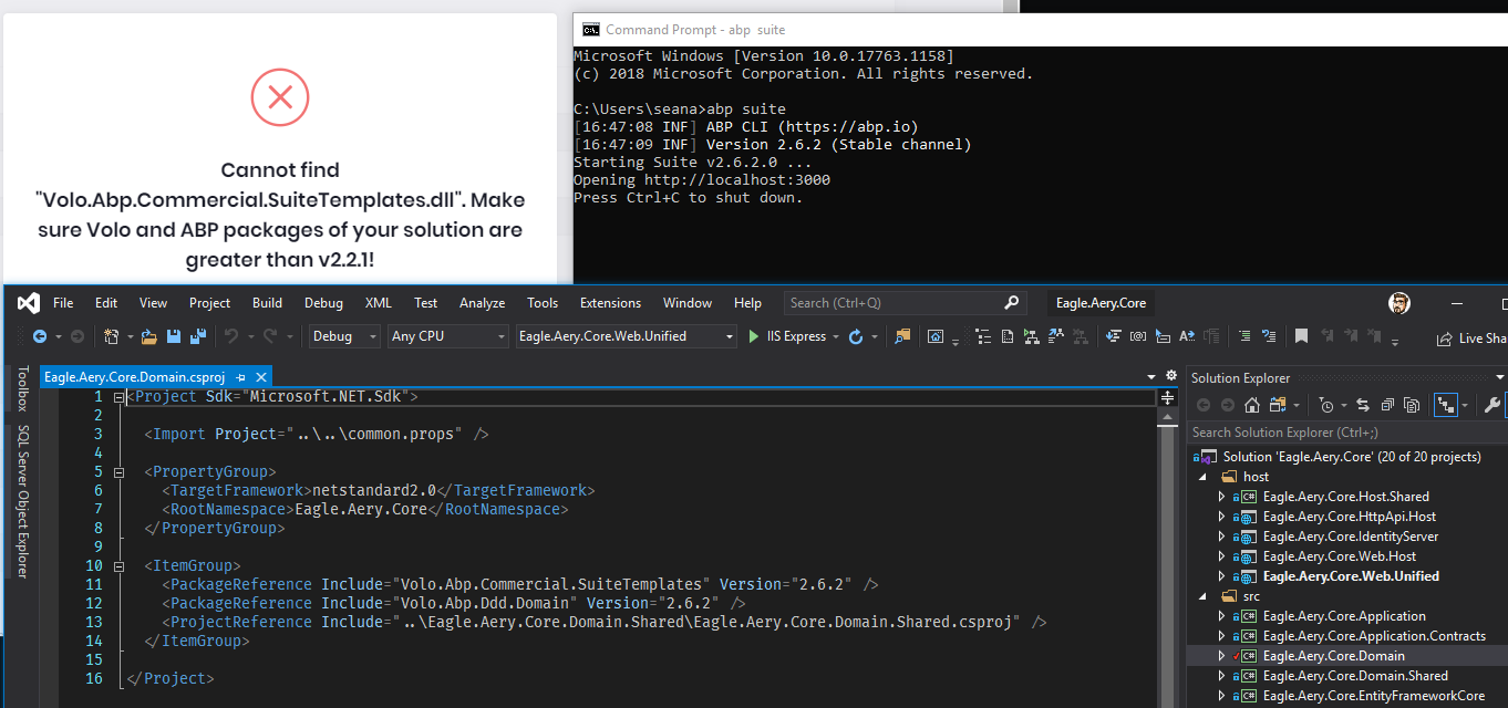I am using abp cli and abp suite version 2.6.2.0. As you can see in the domain project below, I followed Alper's instructions Volo.Abp.Commercial.SuiteTemplate.dll from #48. However, I am still receiving this error.