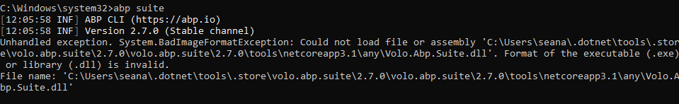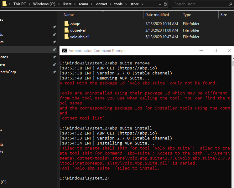 @alper I ran into a new problem this morning when I tried to start ABP.io Suite. I see @roop.yekollu@atlasair.com is have a similar problem. So I followed your instructions to them and manually deleted %UserProfile%\.dotnet\tools\.store\volo.abp.suite. However, as you can see the install is failing.