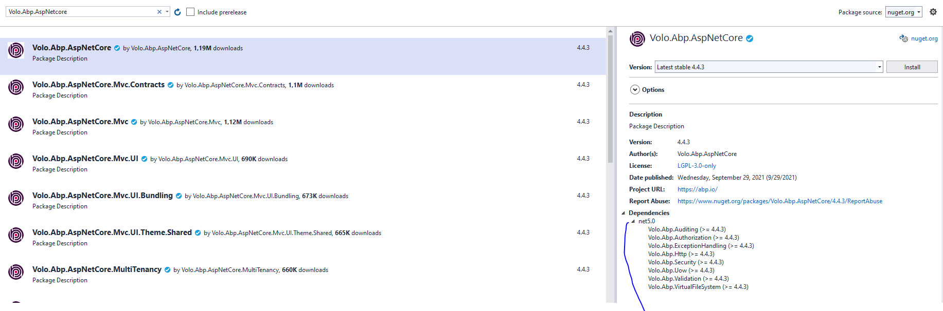 so we couldn't use the package. That's not a problem actually , we need to change target framework to .net 5 .That's ok from our side. BUT for example Volo.Abp.AspNetCore.Mvc.Contracts package still can work with .net standard like below :