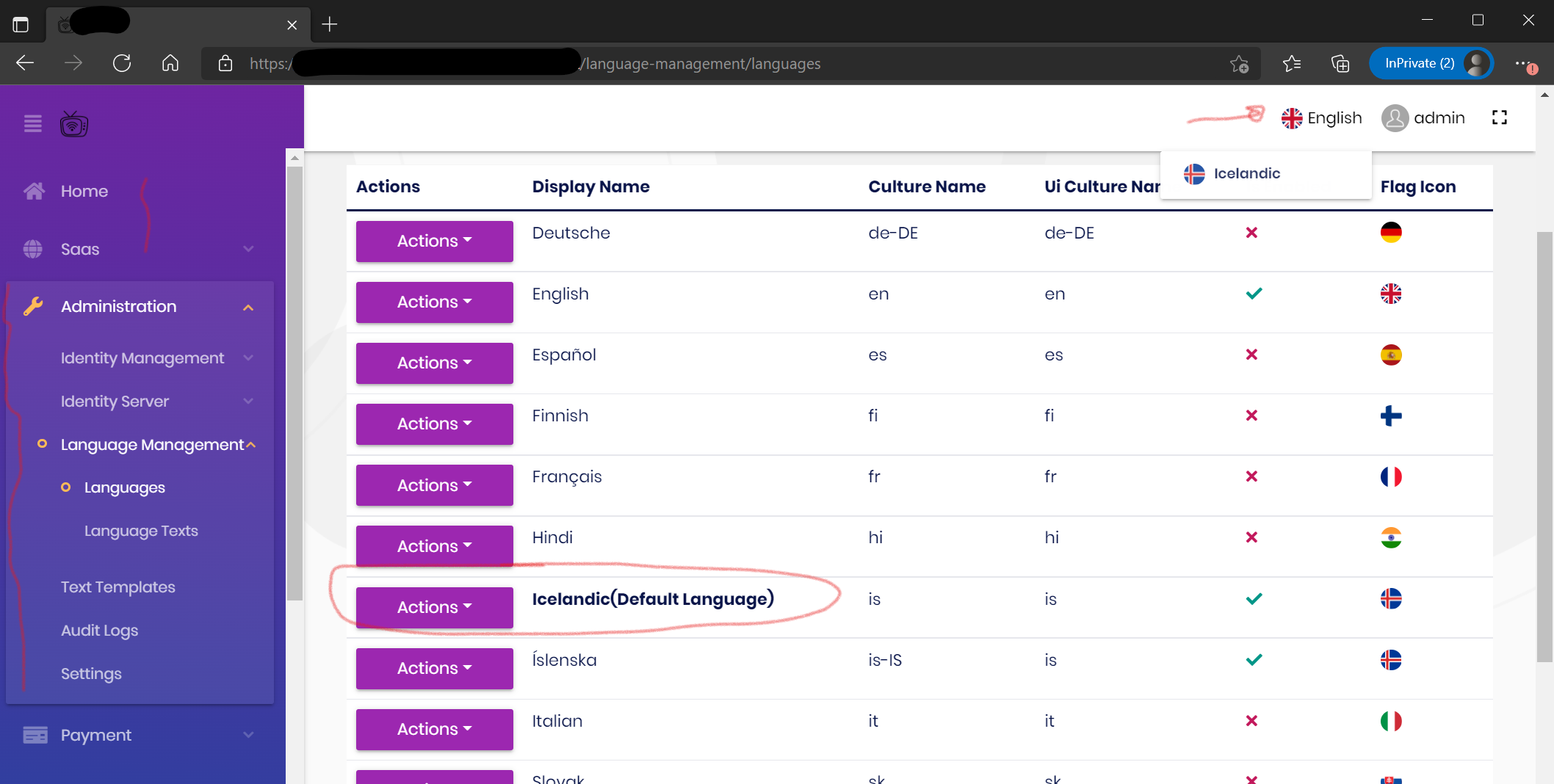 I can´t seem to change default language to Icelandic (on 5.1.1 but I just haven´t tried changing before) EXCEPT by clicking on the flag on the page. Settings don´t seem to do anything