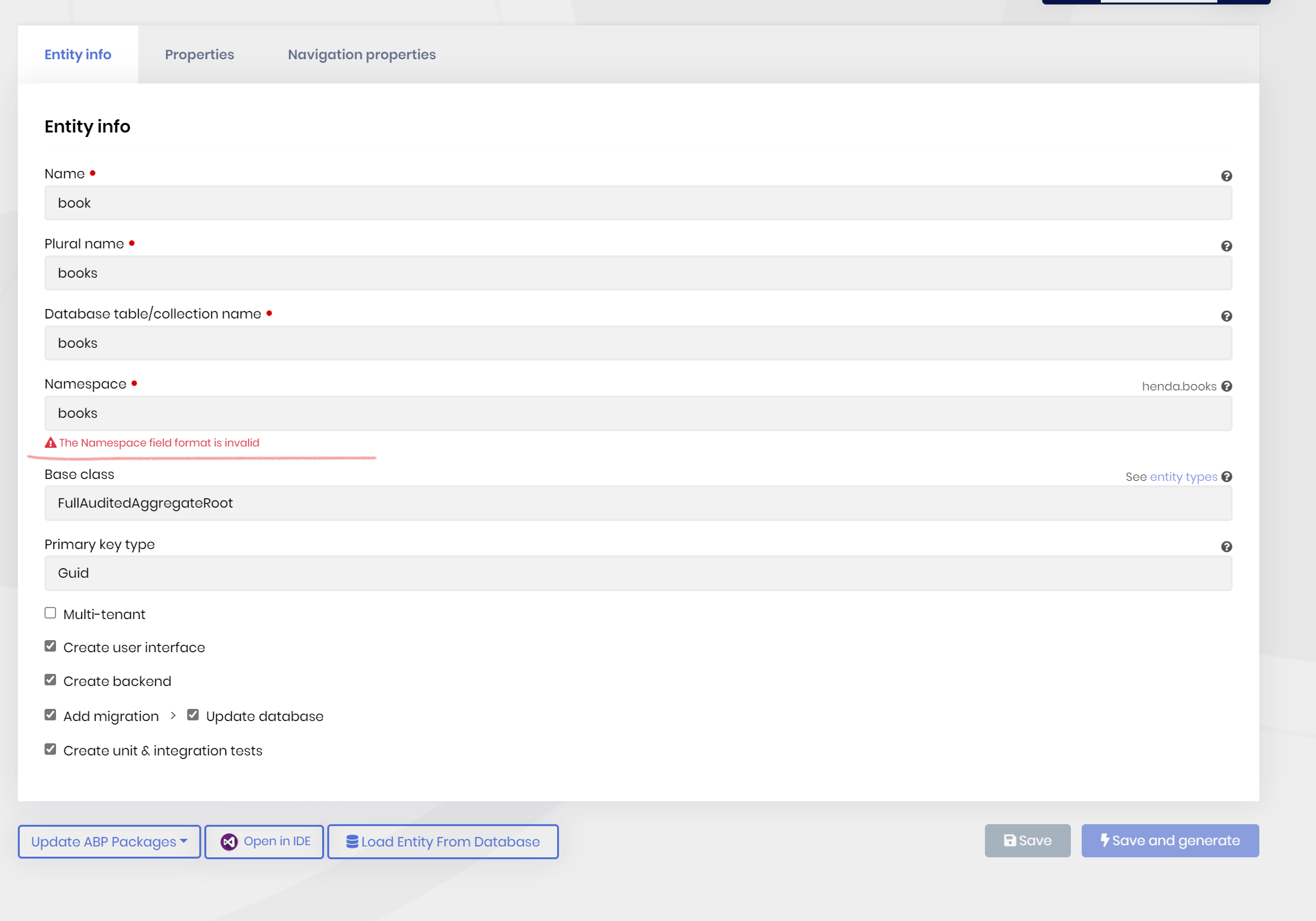 2022-01-14 13:19:01.975 +07:00 [INF] Route matched with {controller = "crudPageGenerator", action = "SaveAndGenerateEntity", area = "", page = ""}. Executing controller action with signature System.Threading.Tasks.Task`1[Microsoft.AspNetCore.Mvc.NoContentResult] SaveAndGenerateEntityAsync(System.Guid, Volo.Abp.Suite.Models.EntityModel) on controller Volo.Abp.Suite.Controllers.CrudPageGeneratorController (Volo.Abp.Suite). 2022-01-14 13:19:02.116 +07:00 [INF] === ENTITY GENERATION STARTED === * SOLUTION: CSM.ServiceRouting * ENTITY:{ "Id": "18d0ecee-c901-4012-8f62-74aa388e9256", "Name": "Channel", "OriginalName": "Channel", "NamePlural": "Channels", "DatabaseTableName": "Channels", "Namespace": "Channels", "BaseClass": "Entity", "PrimaryKeyType": "Guid", "IsMultiTenant": false, "ShouldCreateUserInterface": true, "ShouldCreateBackend": true, "ShouldAddMigration": true, "ShouldUpdateDatabase": true, "CreateTests": true, "Properties": [ { "Id": "6c2e9664-63b2-4dc5-9d80-ea7ae467917f", "Name": "Type", "Type": "enum", "EnumType": "ChannelType", "EnumNamespace": "CSM.ServiceRouting", "EnumAngularImport": "shared/enums/channel-type", "IsNullable": false, "IsRequired": false, "MinLength": null, "MaxLength": null, "SortOrder": 0, "SortType": 0, "Regex": "", "EmailValidation": false, "EnumValues": { "Email": null, "Message": null, "Telephone": null }, "IsSelected": true }, { "Id": "85ebf5b9-f626-4962-bf6b-1cb95a884b4d", "Name": "Name", "Type": "string", "EnumType": "", "EnumNamespace": "", "EnumAngularImport": "shared/enums", "IsNullable": false, "IsRequired": false, "MinLength": null, "MaxLength": null, "SortOrder": 0, "SortType": 0, "Regex": "", "EmailValidation": false, "EnumValues": null, "IsSelected": true } ], "NavigationProperties": [], "PhysicalFileName": "Channel.json" } 2022-01-14 13:19:02.117 +07:00 [INF] 1/11 - EntityGenerateCommand started... 2022-01-14 13:19:03.805 +07:00 [ERR] ---------- RemoteServiceErrorInfo ---------- { "code": null, "message": "An internal error occurred during your request!", "details": null, "data": {}, "validationErrors": null } 2022-01-14 13:19:03.815 +07:00 [ERR] Index was out of range. Must be non-negative and less than the size of the collection. (Parameter 'startIndex') System.ArgumentOutOfRangeException: Index was out of range. Must be non-negative and less than the size of the collection. (Parameter 'startIndex') at System.Globalization.CompareInfo.IndexOf(String source, String value, Int32 startIndex, Int32 count, CompareOptions options) at System.String.IndexOf(String value, Int32 startIndex, Int32 count, StringComparison comparisonType) at System.String.IndexOf(String value, Int32 startIndex, StringComparison comparisonType) at Volo.Abp.Suite.Areas.AbpSuite.CrudPageGenerator.Commands.EntityGenerateCommand.F1AAu43krY(String , String , String ) at Volo.Abp.Suite.Areas.AbpSuite.CrudPageGenerator.Commands.EntityGenerateCommand.IBpAlr5Quy(String , String , Boolean ) at Volo.Abp.Suite.Areas.AbpSuite.CrudPageGenerator.Commands.EntityGenerateCommand.MYcAWPr5GZ(String , String , Boolean , DatabaseProvider ) at Volo.Abp.Suite.Areas.AbpSuite.CrudPageGenerator.Commands.EntityGenerateCommand.yreAdjUhWH(String , DatabaseProvider ) at Volo.Abp.Suite.Areas.AbpSuite.CrudPageGenerator.Commands.EntityGenerateCommand.cqSAJdEgpq() at Volo.Abp.Suite.Areas.AbpSuite.CrudPageGenerator.Commands.EntityGenerateCommand.ExecuteAsync(CrudPageCommandOptions options) at Volo.Abp.Suite.Areas.AbpSuite.CrudPageGenerator.CommandManager.ExecuteAllAsync(CrudPageCommandOptions options) at Volo.Abp.Suite.Areas.AbpSuite.CrudPageGenerator.Commands.CrudPageGenerator.GenerateAsync(EntityModel entity, Solution solution) at Volo.Abp.Suite.Controllers.CrudPageGeneratorController.SaveAndGenerateEntityAsync(Guid solutionId, EntityModel entity) at lambda_method2108(Closure , Object ) at Microsoft.AspNetCore.Mvc.Infrastructure.ActionMethodExecutor.TaskOfActionResultExecutor.Execute(IActionResultTypeMapper mapper, ObjectMethodExecutor executor, Object controller, Object[] arguments) at Microsoft.AspNetCore.Mvc.Infrastructure.ControllerActionInvoker.<InvokeActionMethodAsync>g__Awaited|12_0(ControllerActionInvoker invoker, ValueTask`1 actionResultValueTask) at Microsoft.AspNetCore.Mvc.Infrastructure.ControllerActionInvoker.<InvokeNextActionFilterAsync>g__Awaited|10_0(ControllerActionInvoker invoker, Task lastTask, State next, Scope scope, Object state, Boolean isCompleted) at Microsoft.AspNetCore.Mvc.Infrastructure.ControllerActionInvoker.Rethrow(ActionExecutedContextSealed context) at Microsoft.AspNetCore.Mvc.Infrastructure.ControllerActionInvoker.Next(State& next, Scope& scope, Object& state, Boolean& isCompleted) at Microsoft.AspNetCore.Mvc.Infrastructure.ControllerActionInvoker.<InvokeInnerFilterAsync>g__Awaited|13_0(ControllerActionInvoker invoker, Task lastTask, State next, Scope scope, Object state, Boolean isCompleted) at Microsoft.AspNetCore.Mvc.Infrastructure.ResourceInvoker.<InvokeNextExceptionFilterAsync>g__Awaited|26_0(ResourceInvoker invoker, Task lastTask, State next, Scope scope, Object state, Boolean isCompleted) 2022-01-14 13:19:03.847 +07:00 [INF] Executing ObjectResult, writing value of type 'Volo.Abp.Http.RemoteServiceErrorResponse'.this might be related to the file-scoped namespaces. we have created an internal issue and will be fixed 5.1.2