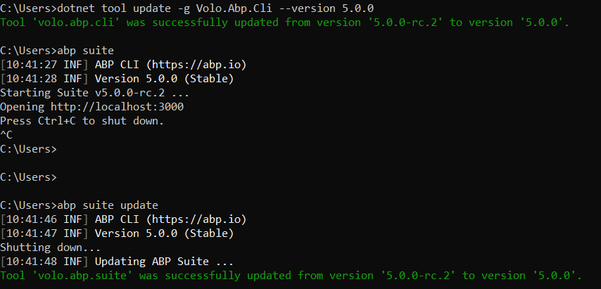 dotnet tool update -g Volo.Abp.Cli --version *-rc* && abp suite update --preview