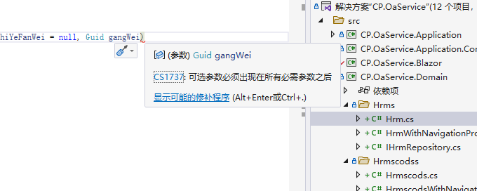 public %%entity-name%%(%%primary-key%% id, %**%constructor-parameters%%**) { Id = id; %%constructor-parameters-with-values%% }IF Entity has NavigationProperties and optional parameters, NavigationPropertie's primary key is at the end of parameters then get this error."CS1737: Optional parameters must appear after all required parameters."
