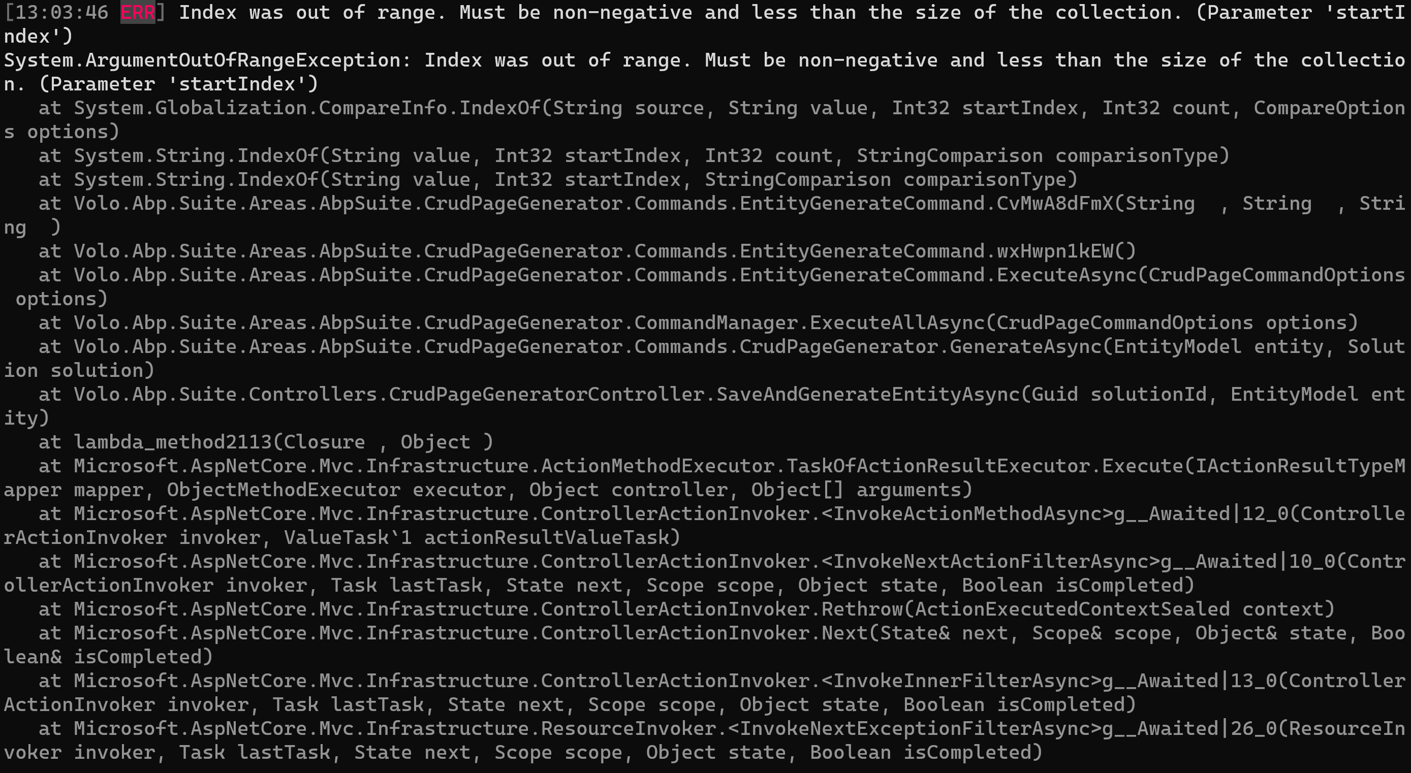 Volo.Abp.AspNetCore.Mvc.UI.Bundling.TagHelpers.AbpTagHelperResourceService.ProcessAsync(ViewContext viewContext, TagHelper tagHelper, TagHelperContext context, TagHelperOutput output, List<BundleTagHelperItem> bundleItems, string bundleName) Volo.Abp.AspNetCore.Mvc.UI.Bundling.TagHelpers.AbpBundleTagHelperService<TTagHelper, TService>.ProcessAsync(TagHelperContext context, TagHelperOutput output) Microsoft.AspNetCore.Razor.Runtime.TagHelpers.TagHelperRunner.<RunAsync>g__Awaited|0_0(Task task, TagHelperExecutionContext executionContext, int i, int count) MIBS.Blazor.Pages.Pages__Host.<ExecuteAsync>b__17_0() in _Host.cshtml + <abp-style-bundle name="@BlazorLeptonThemeBundles.Styles.Global" /> Microsoft.AspNetCore.Razor.Runtime.TagHelpers.TagHelperExecutionContext.SetOutputContentAsync() MIBS.Blazor.Pages.Pages__Host.ExecuteAsync() in _Host.cshtml + <html lang="@CultureInfo.CurrentCulture.Name" dir="@rtl"> Microsoft.AspNetCore.Mvc.Razor.RazorView.RenderPageCoreAsync(IRazorPage page, ViewContext context) Microsoft.AspNetCore.Mvc.Razor.RazorView.RenderPageAsync(IRazorPage page, ViewContext context, bool invokeViewStarts) Microsoft.AspNetCore.Mvc.Razor.RazorView.RenderAsync(ViewContext context) Microsoft.AspNetCore.Mvc.ViewFeatures.ViewExecutor.ExecuteAsync(ViewContext viewContext, string contentType, Nullable<int> statusCode) Microsoft.AspNetCore.Mvc.ViewFeatures.ViewExecutor.ExecuteAsync(ViewContext viewContext, string contentType, Nullable<int> statusCode) Microsoft.AspNetCore.Mvc.Infrastructure.ResourceInvoker.<InvokeNextResultFilterAsync>g__Awaited|30_0<TFilter, TFilterAsync>(ResourceInvoker invoker, Task lastTask, State next, Scope scope, object state, bool isCompleted) Microsoft.AspNetCore.Mvc.Infrastructure.ResourceInvoker.Rethrow(ResultExecutedContextSealed context) Microsoft.AspNetCore.Mvc.Infrastructure.ResourceInvoker.ResultNext<TFilter, TFilterAsync>(ref State next, ref Scope scope, ref object state, ref bool isCompleted) Microsoft.AspNetCore.Mvc.Infrastructure.ResourceInvoker.<InvokeResultFilters>g__Awaited|28_0(ResourceInvoker invoker, Task lastTask, State next, Scope scope, object state, bool isCompleted) Microsoft.AspNetCore.Mvc.Infrastructure.ResourceInvoker.<InvokeNextResourceFilter>g__Awaited|25_0(ResourceInvoker invoker, Task lastTask, State next, Scope scope, object state, bool isCompleted) Microsoft.AspNetCore.Mvc.Infrastructure.ResourceInvoker.Rethrow(ResourceExecutedContextSealed context) Microsoft.AspNetCore.Mvc.Infrastructure.ResourceInvoker.Next(ref State next, ref Scope scope, ref object state, ref bool isCompleted) Microsoft.AspNetCore.Mvc.Infrastructure.ResourceInvoker.<InvokeFilterPipelineAsync>g__Awaited|20_0(ResourceInvoker invoker, Task lastTask, State next, Scope scope, object state, bool isCompleted) Microsoft.AspNetCore.Mvc.Infrastructure.ResourceInvoker.<InvokeAsync>g__Logged|17_1(ResourceInvoker invoker) Microsoft.AspNetCore.Mvc.Infrastructure.ResourceInvoker.<InvokeAsync>g__Logged|17_1(ResourceInvoker invoker) Microsoft.AspNetCore.Routing.EndpointMiddleware.<Invoke>g__AwaitRequestTask|6_0(Endpoint endpoint, Task requestTask, ILogger logger) Volo.Abp.AspNetCore.Serilog.AbpSerilogMiddleware.InvokeAsync(HttpContext context, RequestDelegate next) Microsoft.AspNetCore.Builder.UseMiddlewareExtensions+<>c__DisplayClass6_1+<<UseMiddlewareInterface>b__1>d.MoveNext() Volo.Abp.AspNetCore.Auditing.AbpAuditingMiddleware.InvokeAsync(HttpContext context, RequestDelegate next) Volo.Abp.AspNetCore.Auditing.AbpAuditingMiddleware.InvokeAsync(HttpContext context, RequestDelegate next) Microsoft.AspNetCore.Builder.UseMiddlewareExtensions+<>c__DisplayClass6_1+<<UseMiddlewareInterface>b__1>d.MoveNext() Swashbuckle.AspNetCore.SwaggerUI.SwaggerUIMiddleware.Invoke(HttpContext httpContext) Swashbuckle.AspNetCore.Swagger.SwaggerMiddleware.Invoke(HttpContext httpContext, ISwaggerProvider swaggerProvider) Microsoft.AspNetCore.Authorization.AuthorizationMiddleware.Invoke(HttpContext context) IdentityServer4.Hosting.IdentityServerMiddleware.Invoke(HttpContext context, IEndpointRouter router, IUserSession session, IEventService events, IBackChannelLogoutService backChannelLogoutService) IdentityServer4.Hosting.MutualTlsEndpointMiddleware.Invoke(HttpContext context, IAuthenticationSchemeProvider schemes) Microsoft.AspNetCore.Authentication.AuthenticationMiddleware.Invoke(HttpContext context) IdentityServer4.Hosting.BaseUrlMiddleware.Invoke(HttpContext context) Volo.Abp.AspNetCore.Uow.AbpUnitOfWorkMiddleware.InvokeAsync(HttpContext context, RequestDelegate next) Microsoft.AspNetCore.Builder.UseMiddlewareExtensions+<>c__DisplayClass6_1+<<UseMiddlewareInterface>b__1>d.MoveNext() Volo.Abp.AspNetCore.ExceptionHandling.AbpExceptionHandlingMiddleware.InvokeAsync(HttpContext context, RequestDelegate next) Volo.Abp.AspNetCore.ExceptionHandling.AbpExceptionHandlingMiddleware.InvokeAsync(HttpContext context, RequestDelegate next) Microsoft.AspNetCore.Builder.UseMiddlewareExtensions+<>c__DisplayClass6_1+<<UseMiddlewareInterface>b__1>d.MoveNext() Volo.Abp.AspNetCore.MultiTenancy.MultiTenancyMiddleware.InvokeAsync(HttpContext context, RequestDelegate next) Microsoft.AspNetCore.Builder.UseMiddlewareExtensions+<>c__DisplayClass6_1+<<UseMiddlewareInterface>b__1>d.MoveNext() Microsoft.AspNetCore.Builder.ApplicationBuilderAbpJwtTokenMiddlewareExtension+<>c__DisplayClass0_0+<<UseJwtTokenMiddleware>b__0>d.MoveNext() Microsoft.AspNetCore.Authentication.AuthenticationMiddleware.Invoke(HttpContext context) Volo.Abp.AspNetCore.Tracing.AbpCorrelationIdMiddleware.InvokeAsync(HttpContext context, RequestDelegate next) Microsoft.AspNetCore.Builder.UseMiddlewareExtensions+<>c__DisplayClass6_1+<<UseMiddlewareInterface>b__1>d.MoveNext() Microsoft.AspNetCore.Localization.RequestLocalizationMiddleware.Invoke(HttpContext context) Microsoft.AspNetCore.RequestLocalization.AbpRequestLocalizationMiddleware.InvokeAsync(HttpContext context, RequestDelegate next) Microsoft.AspNetCore.Builder.UseMiddlewareExtensions+<>c__Display